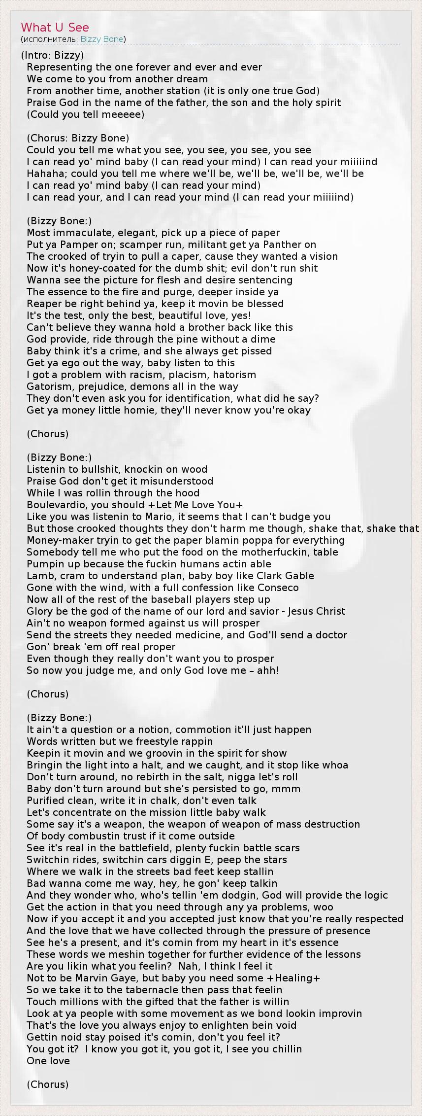 (Intro: Bizzy) Representing the one forever and ever and ever We come to you from another dream From another time, another station (it is only one true God) Praise God in the name of the father, the son and the holy spirit (Could you tell meeeee) (Chorus: Bizzy Bone) Could you tell me what you see, you see, you see, you see I can read yo' mind baby (I can read your mind) I can read your miiiiind Hahaha; could you tell me where we'll be, we'll be, we'll be, we'll be I can read yo' mind baby (I can read your mind) I can read your, and I can read your mind (I can read your miiiiind) (Bizzy Bone:) Most immaculate, elegant, pick up a piece of paper Put ya Pamper on; scamper run, militant get ya Panther on The crooked of tryin to pull a caper, cause they wanted a vision Now it's honey-coated for the dumb shit; evil don't run shit Wanna see the picture for flesh and desire sentencing The essence to the fire and purge, deeper inside ya Reaper be right behind ya, keep it movin be blessed It's the test, only the best, beautiful love, yes! Can't believe they wanna hold a brother back like this God provide, ride through the pine without a dime Baby think it's a crime, and she always get pissed Get ya ego out the way, baby listen to this I got a problem with racism, placism, hatorism Gatorism, prejudice, demons all in the way They don't even ask you for identification, what did he say? Get ya money little homie, they'll never know you're okay (Chorus) (Bizzy Bone:) Listenin to bullshit, knockin on wood Praise God don't get it misunderstood While I was rollin through the hood Boulevardio, you should +Let Me Love You+ Like you was listenin to Mario, it seems that I can't budge you But those crooked thoughts they don't harm me though, shake that, shake that Money-maker tryin to get the paper blamin poppa for everything Somebody tell me who put the food on the motherfuckin, table Pumpin up because the fuckin humans actin able Lamb, cram to understand plan, baby boy like Clark Gable Gone with the wind, with a full confession like Conseco Now all of the rest of the baseball players step up Glory be the god of the name of our lord and savior - Jesus Christ Ain't no weapon formed against us will prosper Send the streets they needed medicine, and God'll send a doctor Gon' break 'em off real proper Even though they really don't want you to prosper So now you judge me, and only God love me – ahh! (Chorus) (Bizzy Bone:) It ain't a question or a notion, commotion it'll just happen Words written but we freestyle rappin Keepin it movin and we groovin in the spirit for show Bringin the light into a halt, and we caught, and it stop like whoa Don't turn around, no rebirth in the salt, nigga let's roll Baby don't turn around but she's persisted to go, mmm Purified clean, write it in chalk, don't even talk Let's concentrate on the mission little baby walk Some say it's a weapon, the weapon of weapon of mass destruction Of body combustin trust if it come outside See it's real in the battlefield, plenty fuckin battle scars Switchin rides, switchin cars diggin E, peep the stars Where we walk in the streets bad feet keep stallin Bad wanna come me way, hey, he gon' keep talkin And they wonder who, who's tellin 'em dodgin, God will provide the logic Get the action in that you need through any ya problems, woo Now if you accept it and you accepted just know that you're really respected And the love that we have collected through the pressure of presence See he's a present, and it's comin from my heart in it's essence These words we meshin together for further evidence of the lessons Are you likin what you feelin? Nah, I think I feel it Not to be Marvin Gaye, but baby you need some +Healing+ So we take it to the tabernacle then pass that feelin Touch millions with the gifted that the father is willin Look at ya people with some movement as we bond lookin improvin That's the love you always enjoy to enlighten bein void Gettin noid stay poised it's comin, don't you feel it? You got it? I know you got it, you got it, I see you chillin One love (Chorus)