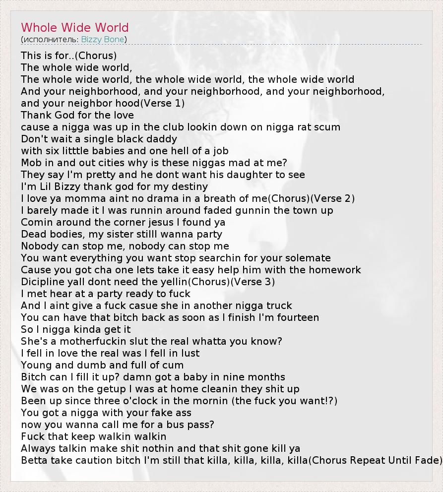 This is for..(Chorus) The whole wide world, The whole wide world, the whole wide world, the whole wide world And your neighborhood, and your neighborhood, and your neighborhood, and your neighbor hood(Verse 1) Thank God for the love cause a nigga was up in the club lookin down on nigga rat scum Don't wait a single black daddy with six litttle babies and one hell of a job Mob in and out cities why is these niggas mad at me? They say I'm pretty and he dont want his daughter to see I'm Lil Bizzy thank god for my destiny I love ya momma aint no drama in a breath of me(Chorus)(Verse 2) I barely made it I was runnin around faded gunnin the town up Comin around the corner jesus I found ya Dead bodies, my sister stilll wanna party Nobody can stop me, nobody can stop me You want everything you want stop searchin for your solemate Cause you got cha one lets take it easy help him with the homework Dicipline yall dont need the yellin(Chorus)(Verse 3) I met hear at a party ready to fuck And I aint give a fuck casue she in another nigga truck You can have that bitch back as soon as I finish I'm fourteen So I nigga kinda get it She's a motherfuckin slut the real whatta you know? I fell in love the real was I fell in lust Young and dumb and full of cum Bitch can I fill it up? damn got a baby in nine months We was on the getup I was at home cleanin they shit up Been up since three o'clock in the mornin (the fuck you want!?) You got a nigga with your fake ass now you wanna call me for a bus pass? Fuck that keep walkin walkin Always talkin make shit nothin and that shit gone kill ya Betta take caution bitch I'm still that killa, killa, killa, killa(Chorus Repeat Until Fade)