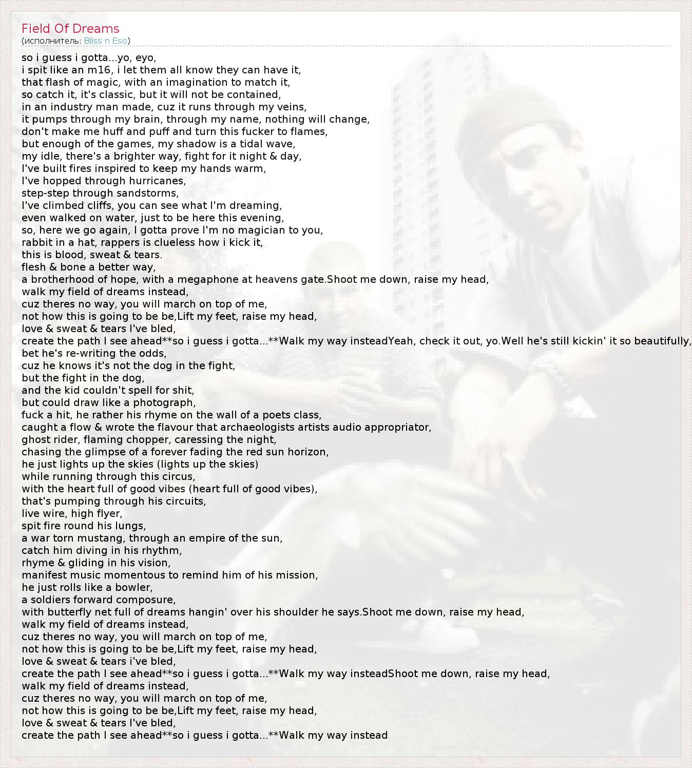 so i guess i gotta...yo, eyo, i spit like an m16, i let them all know they can have it, that flash of magic, with an imagination to match it, so catch it, it's classic, but it will not be contained, in an industry man made, cuz it runs through my veins, it pumps through my brain, through my name, nothing will change, don't make me huff and puff and turn this fucker to flames, but enough of the games, my shadow is a tidal wave, my idle, there's a brighter way, fight for it night & day, I've built fires inspired to keep my hands warm, I've hopped through hurricanes, step-step through sandstorms, I've climbed cliffs, you can see what I'm dreaming, even walked on water, just to be here this evening, so, here we go again, I gotta prove I'm no magician to you, rabbit in a hat, rappers is clueless how i kick it, this is blood, sweat & tears. flesh & bone a better way, a brotherhood of hope, with a megaphone at heavens gate.Shoot me down, raise my head, walk my field of dreams instead, cuz theres no way, you will march on top of me, not how this is going to be be,Lift my feet, raise my head, love & sweat & tears I've bled, create the path I see ahead**so i guess i gotta...**Walk my way insteadYeah, check it out, yo.Well he's still kickin' it so beautifully, bet he's re-writing the odds, cuz he knows it's not the dog in the fight, but the fight in the dog, and the kid couldn't spell for shit, but could draw like a photograph, fuck a hit, he rather his rhyme on the wall of a poets class, caught a flow & wrote the flavour that archaeologists artists audio appropriator, ghost rider, flaming chopper, caressing the night, chasing the glimpse of a forever fading the red sun horizon, he just lights up the skies (lights up the skies) while running through this circus, with the heart full of good vibes (heart full of good vibes), that's pumping through his circuits, live wire, high flyer, spit fire round his lungs, a war torn mustang, through an empire of the sun, catch him diving in his rhythm, rhyme & gliding in his vision, manifest music momentous to remind him of his mission, he just rolls like a bowler, a soldiers forward composure, with butterfly net full of dreams hangin' over his shoulder he says.Shoot me down, raise my head, walk my field of dreams instead, cuz theres no way, you will march on top of me, not how this is going to be be,Lift my feet, raise my head, love & sweat & tears i've bled, create the path I see ahead**so i guess i gotta...**Walk my way insteadShoot me down, raise my head, walk my field of dreams instead, cuz theres no way, you will march on top of me, not how this is going to be be,Lift my feet, raise my head, love & sweat & tears I've bled, create the path I see ahead**so i guess i gotta...**Walk my way instead