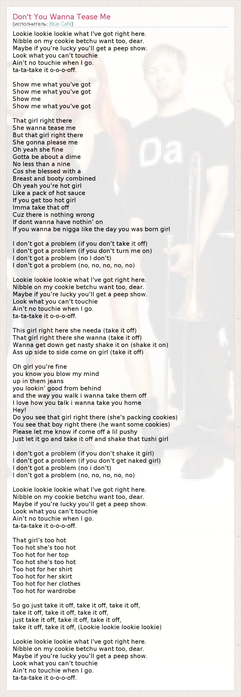 Lookie lookie lookie what I've got right here. Nibble on my cookie betchu want too, dear. Maybe if you're lucky you'll get a peep show. Look what you can't touchie Ain't no touchie when I go. ta-ta-take it o-o-o-off. Show me what you've got Show me what you've got Show me Show me what you've got That girl right there She wanna tease me But that girl right there She gonna please me Oh yeah she fine Gotta be about a dime No less than a nine Cos she blessed with a Breast and booty combined Oh yeah you're hot girl Like a pack of hot sauce If you get too hot girl Imma take that off Cuz there is nothing wrong If dont wanna have nothin' on If you wanna be nigga like the day you was born girl I don't got a problem (if you don't take it off) I don't got a problem (if you don't turn me on) I don't got a problem (no I don't) I don't got a problem (no, no, no, no, no) Lookie lookie lookie what I've got right here. Nibble on my cookie betchu want too, dear. Maybe if you're lucky you'll get a peep show. Look what you can't touchie Ain't no touchie when I go. ta-ta-take it o-o-o-off. This girl right here she needa (take it off) That girl right there she wanna (take it off) Wanna get down get nasty shake it on (shake it on) Ass up side to side come on girl (take it off) Oh girl you're fine you know you blow my mind up in them jeans you lookin' good from behind and the way you walk i wanna take them off I love how you talk i wanna take you home Hey! Do you see that girl right there (she's packing cookies) You see that boy right there (he want some cookies) Please let me know if come off a lil pushy Just let it go and take it off and shake that tushi girl I don't got a problem (if you don't shake it girl) I don't got a problem (if you don't get naked girl) I don't got a problem (no i don't) I don't got a problem (no, no, no, no, no) Lookie lookie lookie what I've got right here. Nibble on my cookie betchu want too, dear. Maybe if you're lucky you'll get a peep show. Look what you can't touchie Ain't no touchie when I go. ta-ta-take it o-o-o-off. That girl's too hot Too hot she's too hot Too hot for her top Too hot she's too hot Too hot for her shirt Too hot for her skirt Too hot for her clothes Too hot for wardrobe So go just take it off, take it off, take it off, take it off, take it off, take it off, just take it off, take it off, take it off, take it off, take it off, (Lookie lookie lookie lookie) Lookie lookie lookie what I've got right here. Nibble on my cookie betchu want too, dear. Maybe if you're lucky you'll get a peep show. Look what you can't touchie Ain't no touchie when I go. ta-ta-take it o-o-o-off.