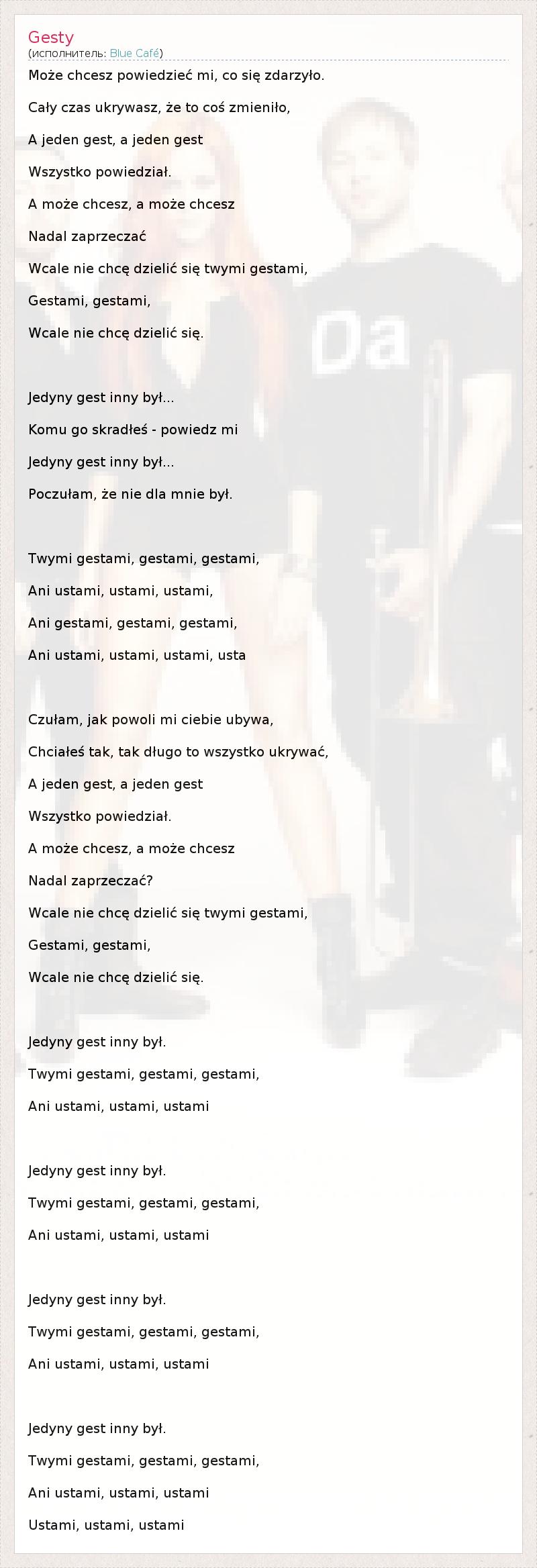 Może chcesz powiedzieć mi, co się zdarzyło. Cały czas ukrywasz, że to coś zmieniło, A jeden gest, a jeden gest Wszystko powiedział. A może chcesz, a może chcesz Nadal zaprzeczać Wcale nie chcę dzielić się twymi gestami, Gestami, gestami, Wcale nie chcę dzielić się. Jedyny gest inny był... Komu go skradłeś - powiedz mi Jedyny gest inny był... Poczułam, że nie dla mnie był. Twymi gestami, gestami, gestami, Ani ustami, ustami, ustami, Ani gestami, gestami, gestami, Ani ustami, ustami, ustami, usta Czułam, jak powoli mi ciebie ubywa, Chciałeś tak, tak długo to wszystko ukrywać, A jeden gest, a jeden gest Wszystko powiedział. A może chcesz, a może chcesz Nadal zaprzeczać? Wcale nie chcę dzielić się twymi gestami, Gestami, gestami, Wcale nie chcę dzielić się. Jedyny gest inny był. Twymi gestami, gestami, gestami, Ani ustami, ustami, ustami Jedyny gest inny był. Twymi gestami, gestami, gestami, Ani ustami, ustami, ustami Jedyny gest inny był. Twymi gestami, gestami, gestami, Ani ustami, ustami, ustami Jedyny gest inny był. Twymi gestami, gestami, gestami, Ani ustami, ustami, ustami Ustami, ustami, ustami