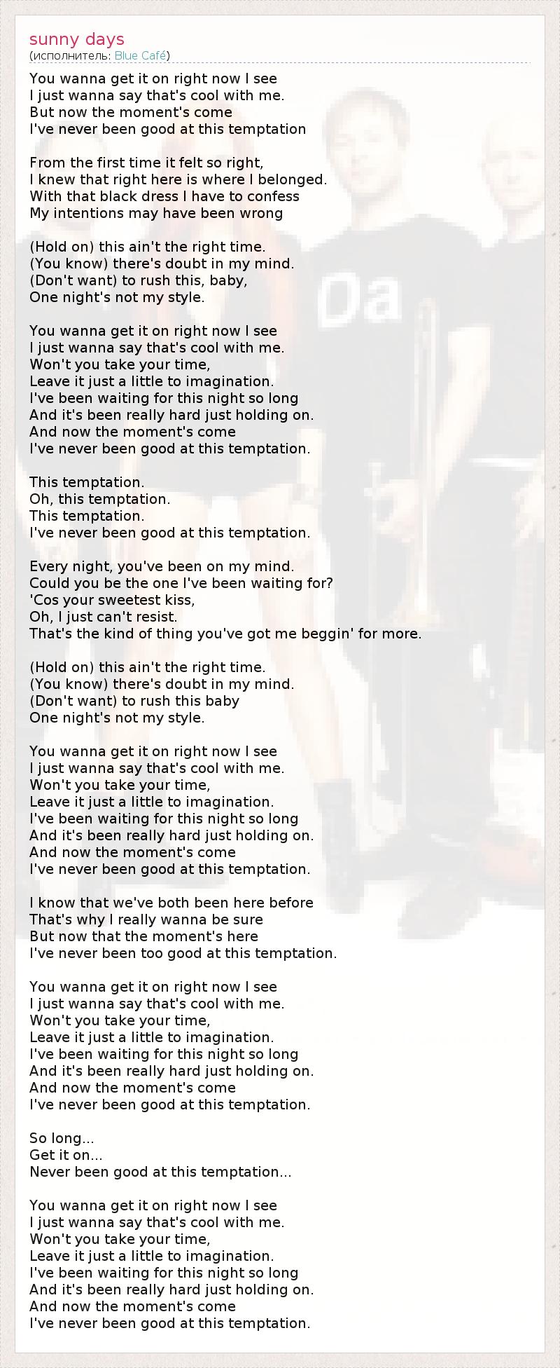 You wanna get it on right now I see I just wanna say that's cool with me. But now the moment's come I've never been good at this temptation From the first time it felt so right, I knew that right here is where I belonged. With that black dress I have to confess My intentions may have been wrong (Hold on) this ain't the right time. (You know) there's doubt in my mind. (Don't want) to rush this, baby, Оne night's not my style. You wanna get it on right now I see I just wanna say that's cool with me. Won't you take your time, Leave it just a little to imagination. I've been waiting for this night so long And it's been really hard just holding on. And now the moment's come I've never been good at this temptation. This temptation. Oh, this temptation. This temptation. I've never been good at this temptation. Every night, you've been on my mind. Could you be the one I've been waiting for? 'Cos your sweetest kiss, Oh, I just can't resist. That's the kind of thing you've got me beggin' for more. (Hold on) this ain't the right time. (You know) there's doubt in my mind. (Don't want) to rush this baby One night's not my style. You wanna get it on right now I see I just wanna say that's cool with me. Won't you take your time, Leave it just a little to imagination. I've been waiting for this night so long And it's been really hard just holding on. And now the moment's come I've never been good at this temptation. I know that we've both been here before That's why I really wanna be sure But now that the moment's here I've never been too good at this temptation. You wanna get it on right now I see I just wanna say that's cool with me. Won't you take your time, Leave it just a little to imagination. I've been waiting for this night so long And it's been really hard just holding on. And now the moment's come I've never been good at this temptation. So long... Get it on... Never been good at this temptation... You wanna get it on right now I see I just wanna say that's cool with me. Won't you take your time, Leave it just a little to imagination. I've been waiting for this night so long And it's been really hard just holding on. And now the moment's come I've never been good at this temptation.