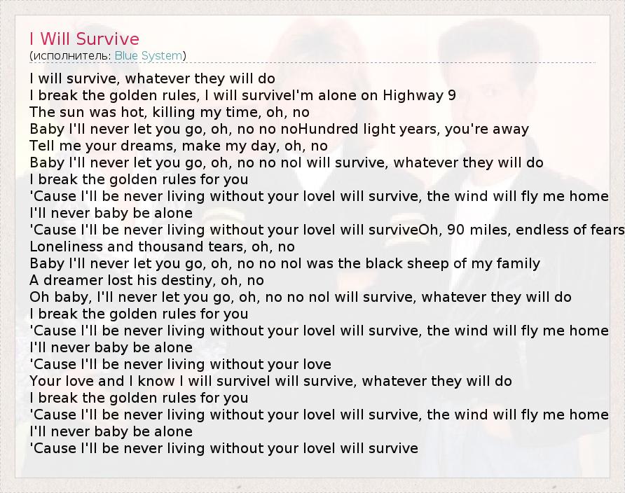 I will survive, whatever they will do I break the golden rules, I will surviveI'm alone on Highway 9 The sun was hot, killing my time, oh, no Baby I'll never let you go, oh, no no noHundred light years, you're away Tell me your dreams, make my day, oh, no Baby I'll never let you go, oh, no no noI will survive, whatever they will do I break the golden rules for you 'Cause I'll be never living without your loveI will survive, the wind will fly me home I'll never baby be alone 'Cause I'll be never living without your loveI will surviveOh, 90 miles, endless of fears Loneliness and thousand tears, oh, no Baby I'll never let you go, oh, no no noI was the black sheep of my family A dreamer lost his destiny, oh, no Oh baby, I'll never let you go, oh, no no noI will survive, whatever they will do I break the golden rules for you 'Cause I'll be never living without your loveI will survive, the wind will fly me home I'll never baby be alone 'Cause I'll be never living without your love Your love and I know I will surviveI will survive, whatever they will do I break the golden rules for you 'Cause I'll be never living without your loveI will survive, the wind will fly me home I'll never baby be alone 'Cause I'll be never living without your loveI will survive