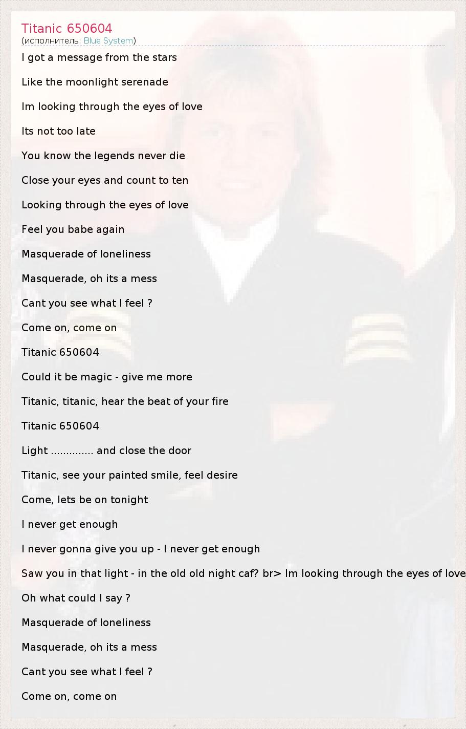 I got a message from the stars Like the moonlight serenade Im looking through the eyes of love Its not too late You know the legends never die Close your eyes and count to ten Looking through the eyes of love Feel you babe again Masquerade of loneliness Masquerade, oh its a mess Cant you see what I feel ? Come on, come on Titanic 650604 Could it be magic - give me more Titanic, titanic, hear the beat of your fire Titanic 650604 Light .............. and close the door Titanic, see your painted smile, feel desire Come, lets be on tonight I never get enough I never gonna give you up - I never get enough Saw you in that light - in the old old night caf? br> Im looking through the eyes of love Oh what could I say ? Masquerade of loneliness Masquerade, oh its a mess Cant you see what I feel ? Come on, come on