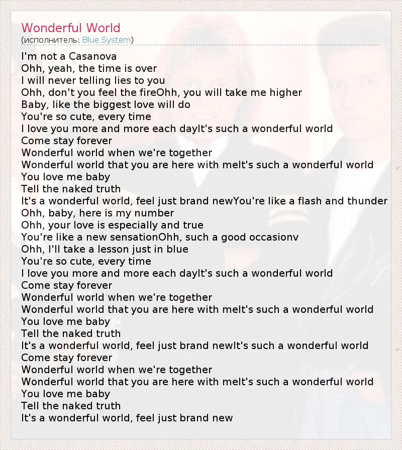 I'm not a Casanova Ohh, yeah, the time is over I will never telling lies to you Ohh, don't you feel the fireOhh, you will take me higher Baby, like the biggest love will do You're so cute, every time I love you more and more each dayIt's such a wonderful world Come stay forever Wonderful world when we're together Wonderful world that you are here with meIt's such a wonderful world You love me baby Tell the naked truth It's a wonderful world, feel just brand newYou're like a flash and thunder Ohh, baby, here is my number Ohh, your love is especially and true You're like a new sensationOhh, such a good occasionv Ohh, I'll take a lesson just in blue You're so cute, every time I love you more and more each dayIt's such a wonderful world Come stay forever Wonderful world when we're together Wonderful world that you are here with meIt's such a wonderful world You love me baby Tell the naked truth It's a wonderful world, feel just brand newIt's such a wonderful world Come stay forever Wonderful world when we're together Wonderful world that you are here with meIt's such a wonderful world You love me baby Tell the naked truth It's a wonderful world, feel just brand new