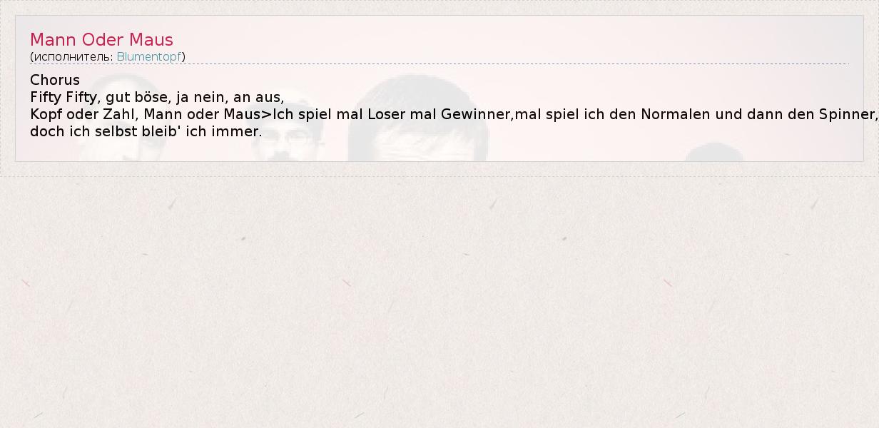 Chorus Fifty Fifty, gut böse, ja nein, an aus, Kopf oder Zahl, Mann oder Maus>Ich spiel mal Loser mal Gewinner,mal spiel ich den Normalen und dann den Spinner, doch ich selbst bleib' ich immer.