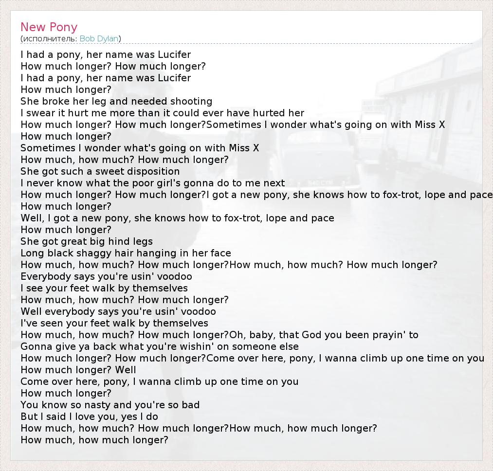 How much longer? How much longer?I got a new pony, she knows how to fox-trot, lope and pace