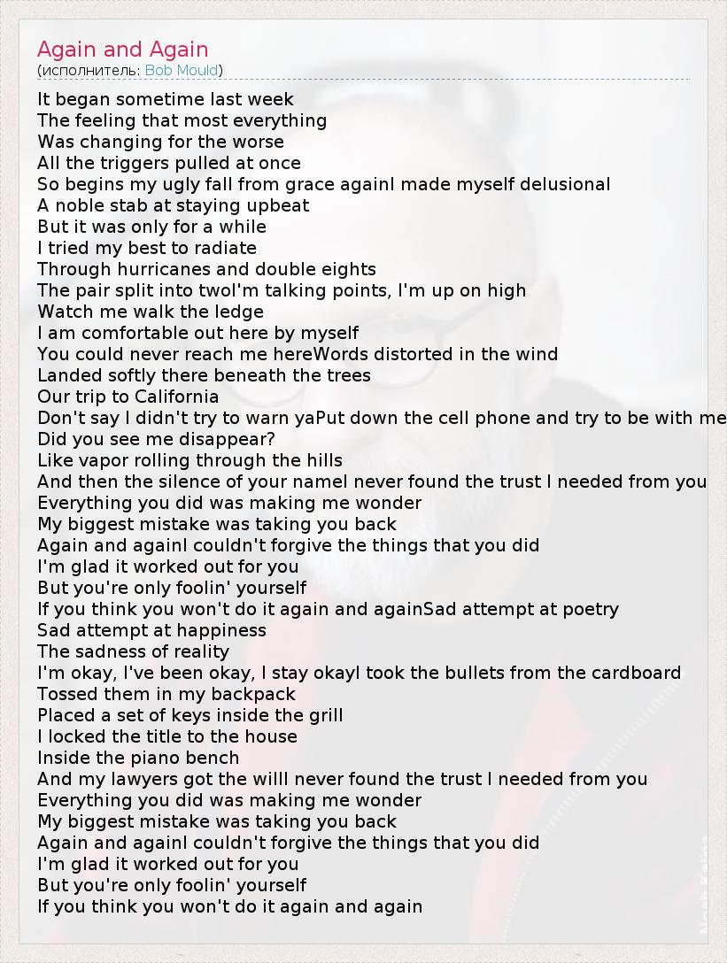 It began sometime last week The feeling that most everything Was changing for the worse All the triggers pulled at once So begins my ugly fall from grace againI made myself delusional A noble stab at staying upbeat But it was only for a while I tried my best to radiate Through hurricanes and double eights The pair split into twoI'm talking points, I'm up on high Watch me walk the ledge I am comfortable out here by myself You could never reach me hereWords distorted in the wind Landed softly there beneath the trees Our trip to California Don't say I didn't try to warn yaPut down the cell phone and try to be with me Did you see me disappear? Like vapor rolling through the hills And then the silence of your nameI never found the trust I needed from you Everything you did was making me wonder My biggest mistake was taking you back Again and againI couldn't forgive the things that you did I'm glad it worked out for you But you're only foolin' yourself If you think you won't do it again and againSad attempt at poetry Sad attempt at happiness The sadness of reality I'm okay, I've been okay, I stay okayI took the bullets from the cardboard Tossed them in my backpack Placed a set of keys inside the grill I locked the title to the house Inside the piano bench And my lawyers got the willI never found the trust I needed from you Everything you did was making me wonder My biggest mistake was taking you back Again and againI couldn't forgive the things that you did I'm glad it worked out for you But you're only foolin' yourself If you think you won't do it again and again