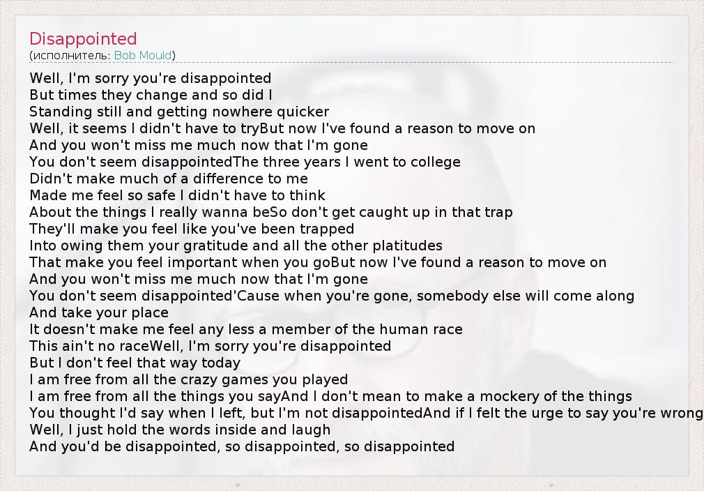 Well, I'm sorry you're disappointed But times they change and so did I Standing still and getting nowhere quicker Well, it seems I didn't have to tryBut now I've found a reason to move on And you won't miss me much now that I'm gone You don't seem disappointedThe three years I went to college Didn't make much of a difference to me Made me feel so safe I didn't have to think About the things I really wanna beSo don't get caught up in that trap They'll make you feel like you've been trapped Into owing them your gratitude and all the other platitudes That make you feel important when you goBut now I've found a reason to move on And you won't miss me much now that I'm gone You don't seem disappointed'Cause when you're gone, somebody else will come along And take your place It doesn't make me feel any less a member of the human race This ain't no raceWell, I'm sorry you're disappointed But I don't feel that way today I am free from all the crazy games you played I am free from all the things you sayAnd I don't mean to make a mockery of the things You thought I'd say when I left, but I'm not disappointedAnd if I felt the urge to say you're wrong Well, I just hold the words inside and laugh And you'd be disappointed, so disappointed, so disappointed