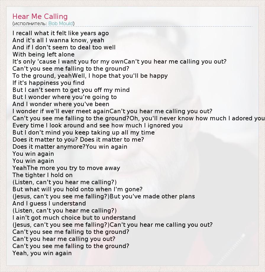 I recall what it felt like years ago And it's all I wanna know, yeah And if I don't seem to deal too well With being left alone It's only 'cause I want you for my ownCan't you hear me calling you out? Can't you see me falling to the ground? To the ground, yeahWell, I hope that you'll be happy If it's happiness you find But I can't seem to get you off my mind But I wonder where you're going to And I wonder where you've been I wonder if we'll ever meet againCan't you hear me calling you out? Can't you see me falling to the ground?Oh, you'll never know how much I adored you Every time I look around and see how much I ignored you But I don't mind you keep taking up all my time Does it matter to you? Does it matter to me? Does it matter anymore?You win again You win again You win again YeahThe more you try to move away The tighter I hold on (Listen, can't you hear me calling?) But what will you hold onto when I'm gone? (Jesus, can't you see me falling?)But you've made other plans And I guess I understand (Listen, can't you hear me calling?) I ain't got much choice but to understand (Jesus, can't you see me falling?)Can't you hear me calling you out? Can't you see me falling to the ground? Can't you hear me calling you out? Can't you see me falling to the ground? Yeah, you win again