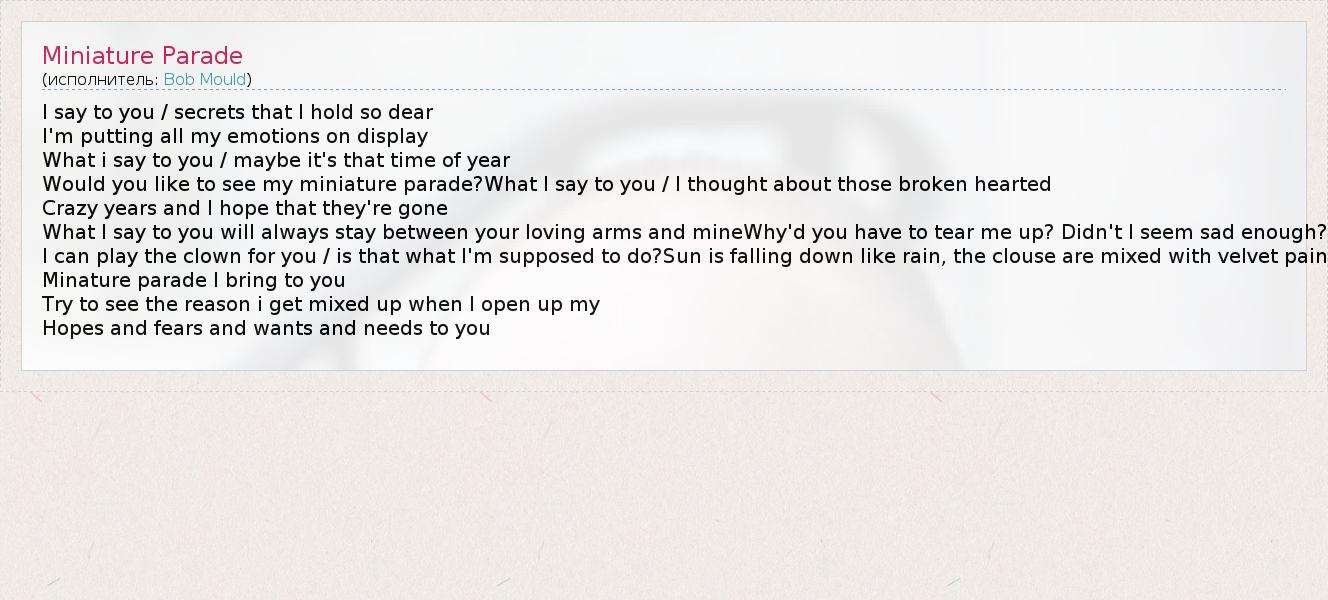 I say to you / secrets that I hold so dear I'm putting all my emotions on display What i say to you / maybe it's that time of year Would you like to see my miniature parade?What I say to you / I thought about those broken hearted Crazy years and I hope that they're gone What I say to you will always stay between your loving arms and mineWhy'd you have to tear me up? Didn't I seem sad enough? I can play the clown for you / is that what I'm supposed to do?Sun is falling down like rain, the clouse are mixed with velvet pain Minature parade I bring to you Try to see the reason i get mixed up when I open up my Hopes and fears and wants and needs to you