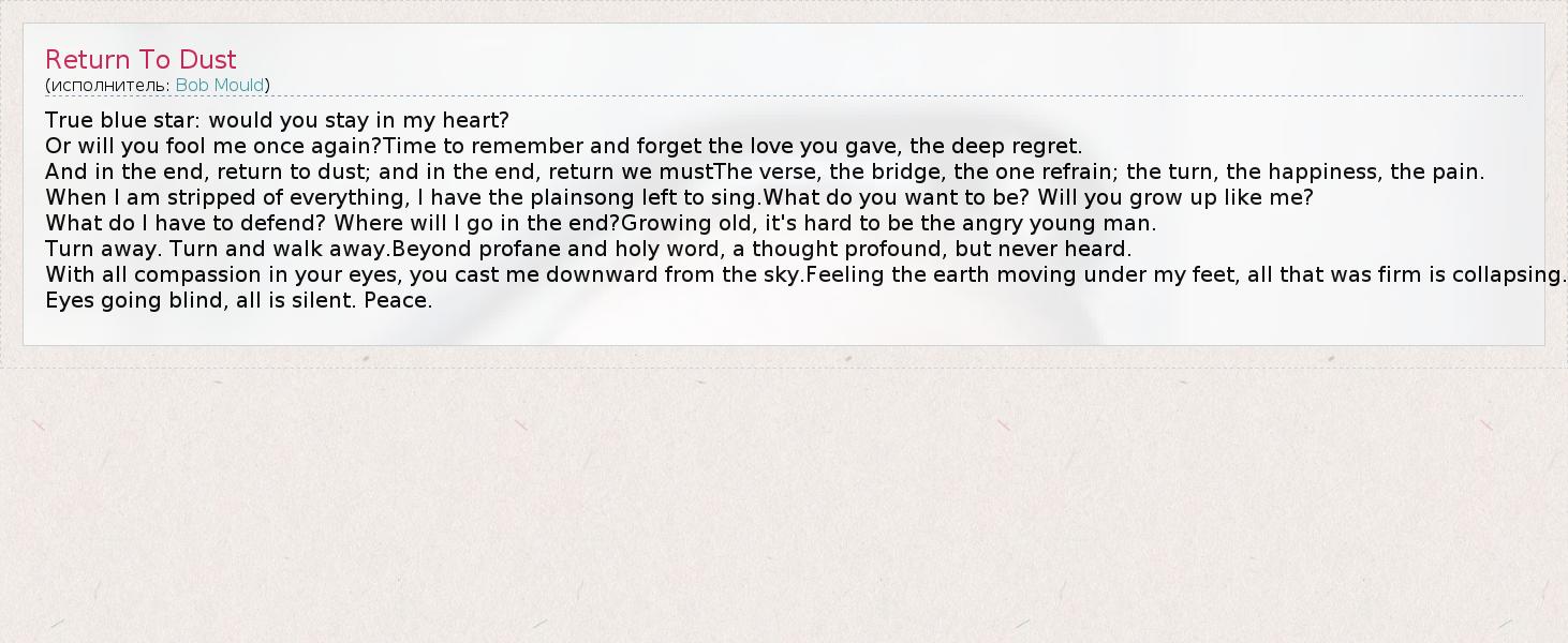 True blue star: would you stay in my heart? Or will you fool me once again?Time to remember and forget the love you gave, the deep regret. And in the end, return to dust; and in the end, return we mustThe verse, the bridge, the one refrain; the turn, the happiness, the pain. When I am stripped of everything, I have the plainsong left to sing.What do you want to be? Will you grow up like me? What do I have to defend? Where will I go in the end?Growing old, it's hard to be the angry young man. Turn away. Turn and walk away.Beyond profane and holy word, a thought profound, but never heard. With all compassion in your eyes, you cast me downward from the sky.Feeling the earth moving under my feet, all that was firm is collapsing. Eyes going blind, all is silent. Peace.