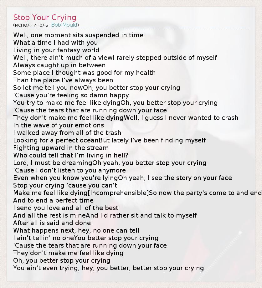 Well, one moment sits suspended in time What a time I had with you Living in your fantasy world Well, there ain't much of a viewI rarely stepped outside of myself Always caught up in between Some place I thought was good for my health Than the place I've always been So let me tell you nowOh, you better stop your crying 'Cause you're feeling so damn happy You try to make me feel like dyingOh, you better stop your crying 'Cause the tears that are running down your face They don't make me feel like dyingWell, I guess I never wanted to crash In the wave of your emotions I walked away from all of the trash Looking for a perfect oceanBut lately I've been finding myself Fighting upward in the stream Who could tell that I'm living in hell? Lord, I must be dreamingOh yeah, you better stop your crying 'Cause I don't listen to you anymore Even when you know you're lyingOh yeah, I see the story on your face Stop your crying 'cause you can't Make me feel like dying[Incomprehensible]So now the party's come to and end And to end a perfect time I send you love and all of the best And all the rest is mineAnd I'd rather sit and talk to myself After all is said and done What happens next, hey, no one can tell I ain't tellin' no oneYou better stop your crying 'Cause the tears that are running down your face They don't make me feel like dying Oh, you better stop your crying You ain't even trying, hey, you better, better stop your crying