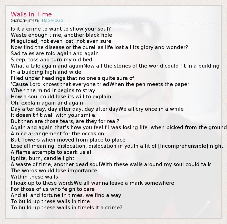 Is it a crime to want to show your soul? Waste enough time, another black hole Misguided, not even lost, not even sure Now find the disease or the cureHas life lost all its glory and wonder? Sad tales are told again and again Sleep, toss and turn my old bed What a tale again and againNow all the stories of the world could fit in a building In a building high and wide Filed under headings that no one's quite sure of 'Cause Lord knows that everyone triedWhen the pen meets the paper When the mind it begins to stray How a soul could lose its will to explain Oh, explain again and again Day after day, day after day, day after dayWe all cry once in a while It doesn't fit well with your smile But then are those tears, are they for real? Again and again that's how you feelIf I was losing life, when picked from the ground A nice arrangement for the occasion But flowers when moved from place to place Lose all meaning, dislocation, dislocation in youIn a fit of [Incomprehensible] night A flame attempts to spark us all Ignite, burn, candle light A waste of time, another dead soulWith these walls around my soul could talk The words would lose importance Within these walls I hoax up to these wordsWe all wanna leave a mark somewhere For those of us who feign to care And all and fortune in times, we find a way To build up these walls in time To build up these walls in timeIs it a crime?