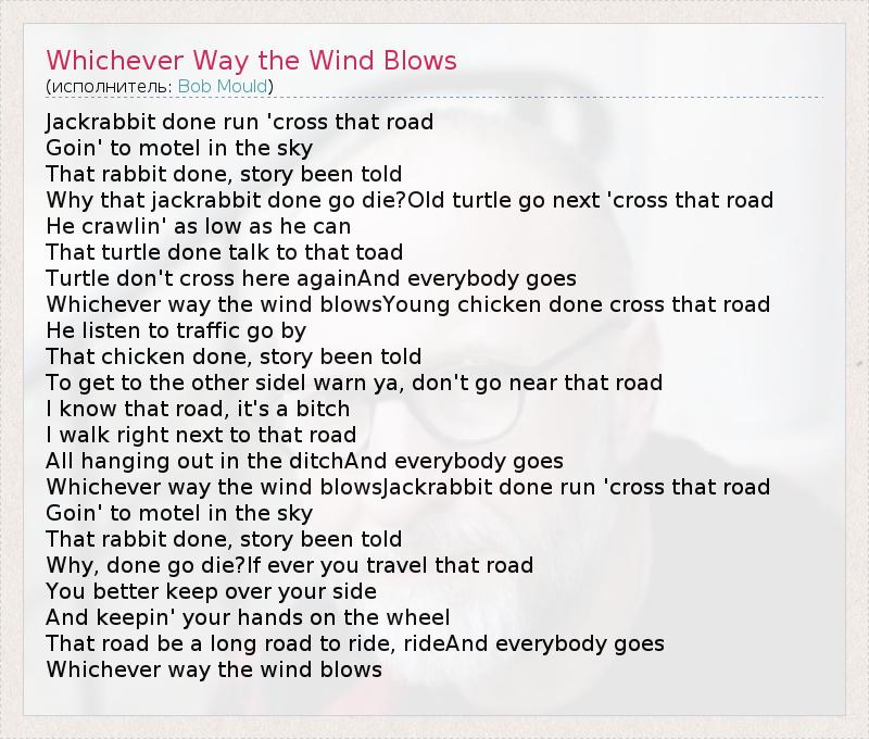 Jackrabbit done run 'cross that road Goin' to motel in the sky That rabbit done, story been told Why that jackrabbit done go die?Old turtle go next 'cross that road He crawlin' as low as he can That turtle done talk to that toad Turtle don't cross here againAnd everybody goes Whichever way the wind blowsYoung chicken done cross that road He listen to traffic go by That chicken done, story been told To get to the other sideI warn ya, don't go near that road I know that road, it's a bitch I walk right next to that road All hanging out in the ditchAnd everybody goes Whichever way the wind blowsJackrabbit done run 'cross that road Goin' to motel in the sky That rabbit done, story been told Why, done go die?If ever you travel that road You better keep over your side And keepin' your hands on the wheel That road be a long road to ride, rideAnd everybody goes Whichever way the wind blows