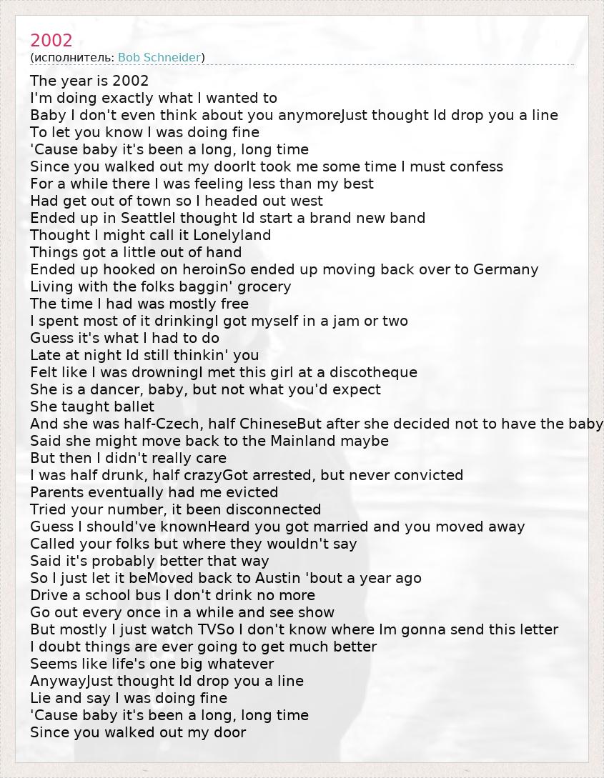 The year is 2002 I'm doing exactly what I wanted to Baby I don't even think about you anymoreJust thought Id drop you a line To let you know I was doing fine 'Cause baby it's been a long, long time Since you walked out my doorIt took me some time I must confess For a while there I was feeling less than my best Had get out of town so I headed out west Ended up in SeattleI thought Id start a brand new band Thought I might call it Lonelyland Things got a little out of hand Ended up hooked on heroinSo ended up moving back over to Germany Living with the folks baggin' grocery The time I had was mostly free I spent most of it drinkingI got myself in a jam or two Guess it's what I had to do Late at night Id still thinkin' you Felt like I was drowningI met this girl at a discotheque She is a dancer, baby, but not what you'd expect She taught ballet And she was half-Czech, half ChineseBut after she decided not to have the baby Said she might move back to the Mainland maybe But then I didn't really care I was half drunk, half crazyGot arrested, but never convicted Parents eventually had me evicted Tried your number, it been disconnected Guess I should've knownHeard you got married and you moved away Called your folks but where they wouldn't say Said it's probably better that way So I just let it beMoved back to Austin 'bout a year ago Drive a school bus I don't drink no more Go out every once in a while and see show But mostly I just watch TVSo I don't know where Im gonna send this letter I doubt things are ever going to get much better Seems like life's one big whatever AnywayJust thought Id drop you a line Lie and say I was doing fine 'Cause baby it's been a long, long time Since you walked out my door