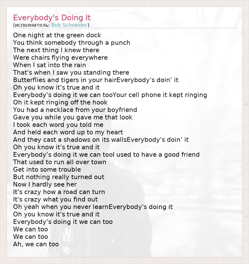 One night at the green dock You think somebody through a punch The next thing I knew there Were chairs flying everywhere When I sat into the rain That's when I saw you standing there Butterflies and tigers in your hairEverybody's doin' it Oh you know it's true and it Everybody's doing it we can tooYour cell phone it kept ringing Oh it kept ringing off the hook You had a necklace from your boyfriend Gave you while you gave me that look I took each word you told me And held each word up to my heart And they cast a shadows on its wallsEverybody's doin' it Oh you know it's true and it Everybody's doing it we can tooI used to have a good friend That used to run all over town Get into some trouble But nothing really turned out Now I hardly see her It's crazy how a road can turn It's crazy what you find out Oh yeah when you never learnEverybody's doing it Oh you know it's true and it Everybody's doing it we can too We can too We can too Ah, we can too