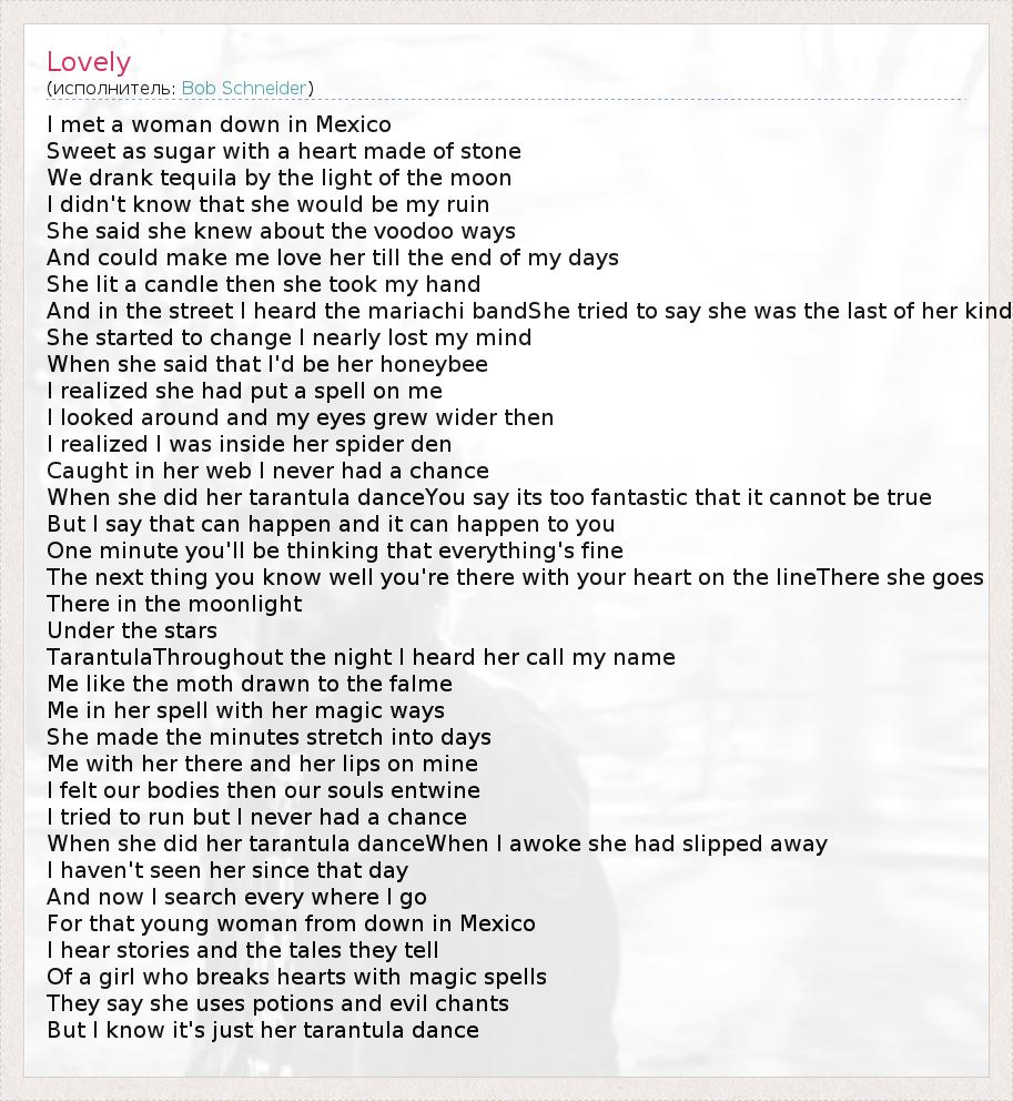 I met a woman down in Mexico Sweet as sugar with a heart made of stone We drank tequila by the light of the moon I didn't know that she would be my ruin She said she knew about the voodoo ways And could make me love her till the end of my days She lit a candle then she took my hand And in the street I heard the mariachi bandShe tried to say she was the last of her kind She started to change I nearly lost my mind When she said that I'd be her honeybee I realized she had put a spell on me I looked around and my eyes grew wider then I realized I was inside her spider den Caught in her web I never had a chance When she did her tarantula danceYou say its too fantastic that it cannot be true But I say that can happen and it can happen to you One minute you'll be thinking that everything's fine The next thing you know well you're there with your heart on the lineThere she goes There in the moonlight Under the stars TarantulaThroughout the night I heard her call my name Me like the moth drawn to the falme Me in her spell with her magic ways She made the minutes stretch into days Me with her there and her lips on mine I felt our bodies then our souls entwine I tried to run but I never had a chance When she did her tarantula danceWhen I awoke she had slipped away I haven't seen her since that day And now I search every where I go For that young woman from down in Mexico I hear stories and the tales they tell Of a girl who breaks hearts with magic spells They say she uses potions and evil chants But I know it's just her tarantula dance