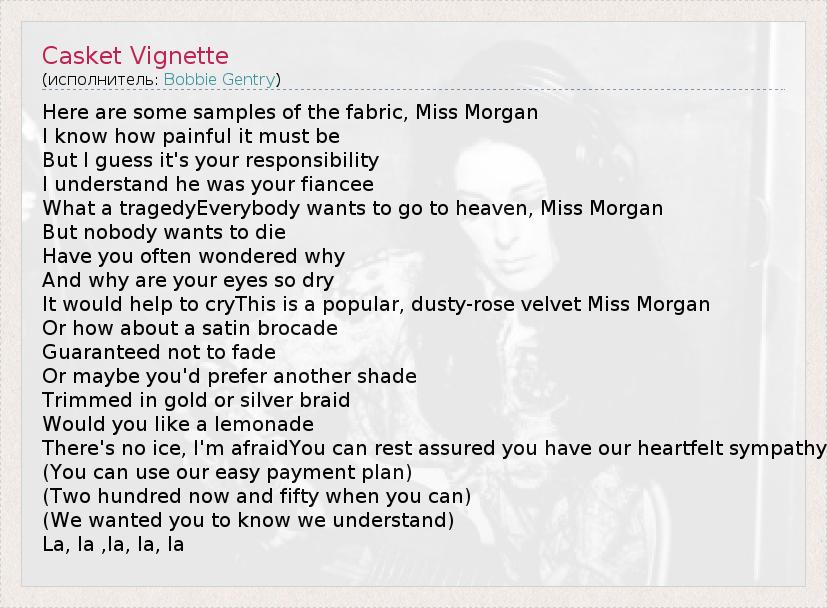 Here are some samples of the fabric, Miss Morgan I know how painful it must be But I guess it's your responsibility I understand he was your fiancee What a tragedyEverybody wants to go to heaven, Miss Morgan But nobody wants to die Have you often wondered why And why are your eyes so dry It would help to cryThis is a popular, dusty-rose velvet Miss Morgan Or how about a satin brocade Guaranteed not to fade Or maybe you'd prefer another shade Trimmed in gold or silver braid Would you like a lemonade There's no ice, I'm afraidYou can rest assured you have our heartfelt sympathy (You can use our easy payment plan) (Two hundred now and fifty when you can) (We wanted you to know we understand) La, la ,la, la, la