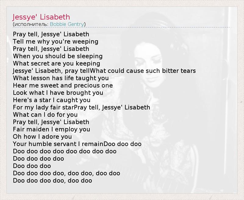 А как ты думаешь, о чем песня "Jessye' Lisabeth" ?