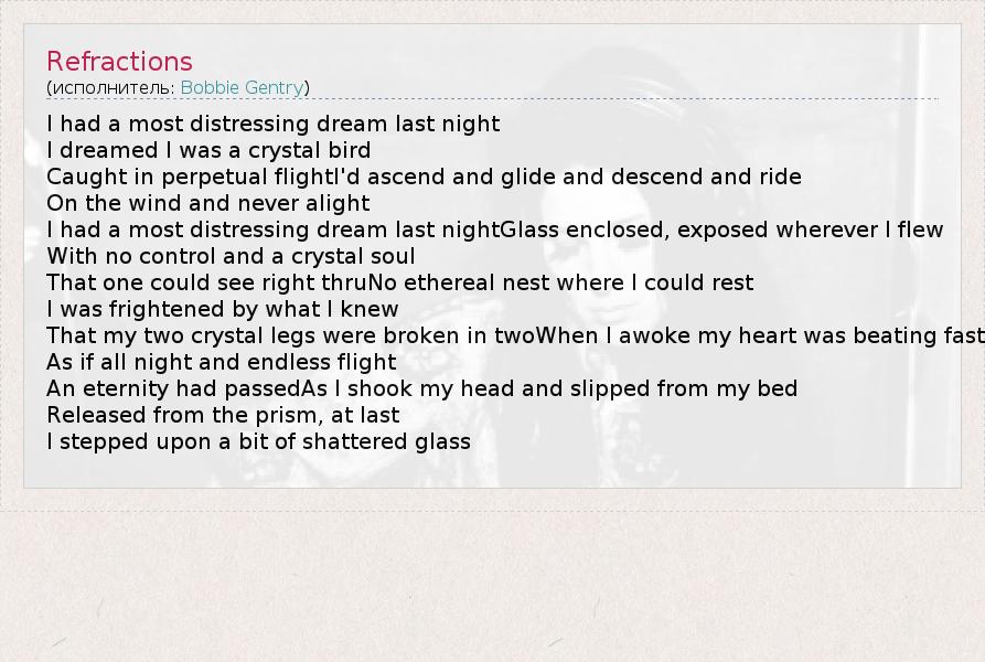 I had a most distressing dream last night I dreamed I was a crystal bird Caught in perpetual flightI'd ascend and glide and descend and ride On the wind and never alight I had a most distressing dream last nightGlass enclosed, exposed wherever I flew With no control and a crystal soul That one could see right thruNo ethereal nest where I could rest I was frightened by what I knew That my two crystal legs were broken in twoWhen I awoke my heart was beating fast As if all night and endless flight An eternity had passedAs I shook my head and slipped from my bed Released from the prism, at last I stepped upon a bit of shattered glass