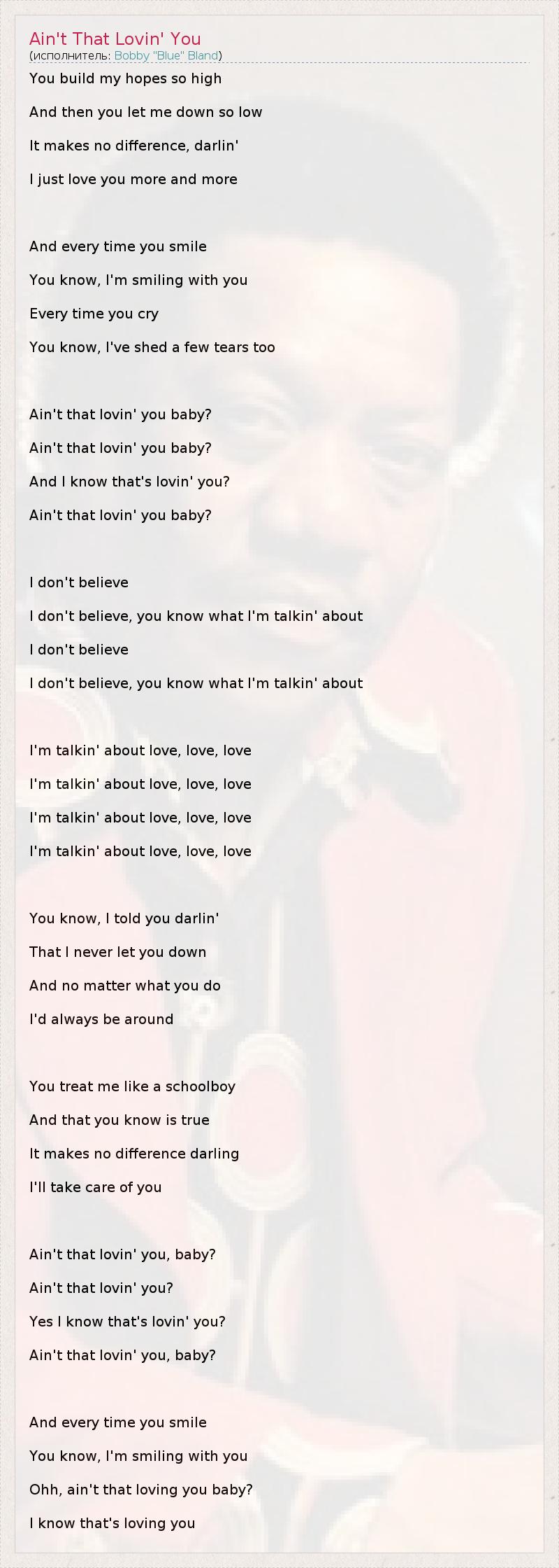 You build my hopes so high And then you let me down so low It makes no difference, darlin' I just love you more and more And every time you smile You know, I'm smiling with you Every time you cry You know, I've shed a few tears too Ain't that lovin' you baby? Ain't that lovin' you baby? And I know that's lovin' you? Ain't that lovin' you baby? I don't believe I don't believe, you know what I'm talkin' about I don't believe I don't believe, you know what I'm talkin' about I'm talkin' about love, love, love I'm talkin' about love, love, love I'm talkin' about love, love, love I'm talkin' about love, love, love You know, I told you darlin' That I never let you down And no matter what you do I'd always be around You treat me like a schoolboy And that you know is true It makes no difference darling I'll take care of you Ain't that lovin' you, baby? Ain't that lovin' you? Yes I know that's lovin' you? Ain't that lovin' you, baby? And every time you smile You know, I'm smiling with you Ohh, ain't that loving you baby? I know that's loving you