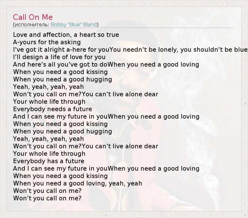 Love and affection, a heart so true A-yours for the asking I've got it alright a-here for youYou needn't be lonely, you shouldn't be blue I'll design a life of love for you And here's all you've got to doWhen you need a good loving When you need a good kissing When you need a good hugging Yeah, yeah, yeah, yeah Won't you call on me?You can't live alone dear Your whole life through Everybody needs a future And I can see my future in youWhen you need a good loving When you need a good kissing When you need a good hugging Yeah, yeah, yeah, yeah Won't you call on me?You can't live alone dear Your whole life through Everybody has a future And I can see my future in youWhen you need a good loving When you need a good kissing When you need a good loving, yeah, yeah Won't you call on me? Won't you call on me?