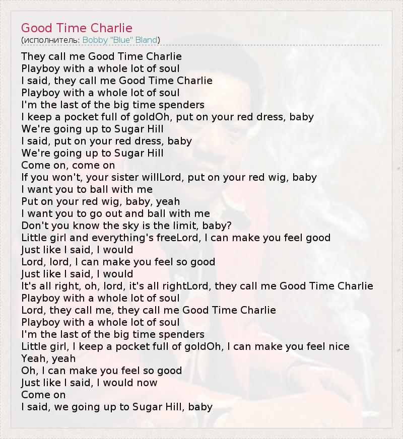 They call me Good Time Charlie Playboy with a whole lot of soul I said, they call me Good Time Charlie Playboy with a whole lot of soul I'm the last of the big time spenders I keep a pocket full of goldOh, put on your red dress, baby We're going up to Sugar Hill I said, put on your red dress, baby We're going up to Sugar Hill Come on, come on If you won't, your sister willLord, put on your red wig, baby I want you to ball with me Put on your red wig, baby, yeah I want you to go out and ball with me Don't you know the sky is the limit, baby? Little girl and everything's freeLord, I can make you feel good Just like I said, I would Lord, lord, I can make you feel so good Just like I said, I would It's all right, oh, lord, it's all rightLord, they call me Good Time Charlie Playboy with a whole lot of soul Lord, they call me, they call me Good Time Charlie Playboy with a whole lot of soul I'm the last of the big time spenders Little girl, I keep a pocket full of goldOh, I can make you feel nice Yeah, yeah Oh, I can make you feel so good Just like I said, I would now Come on I said, we going up to Sugar Hill, baby