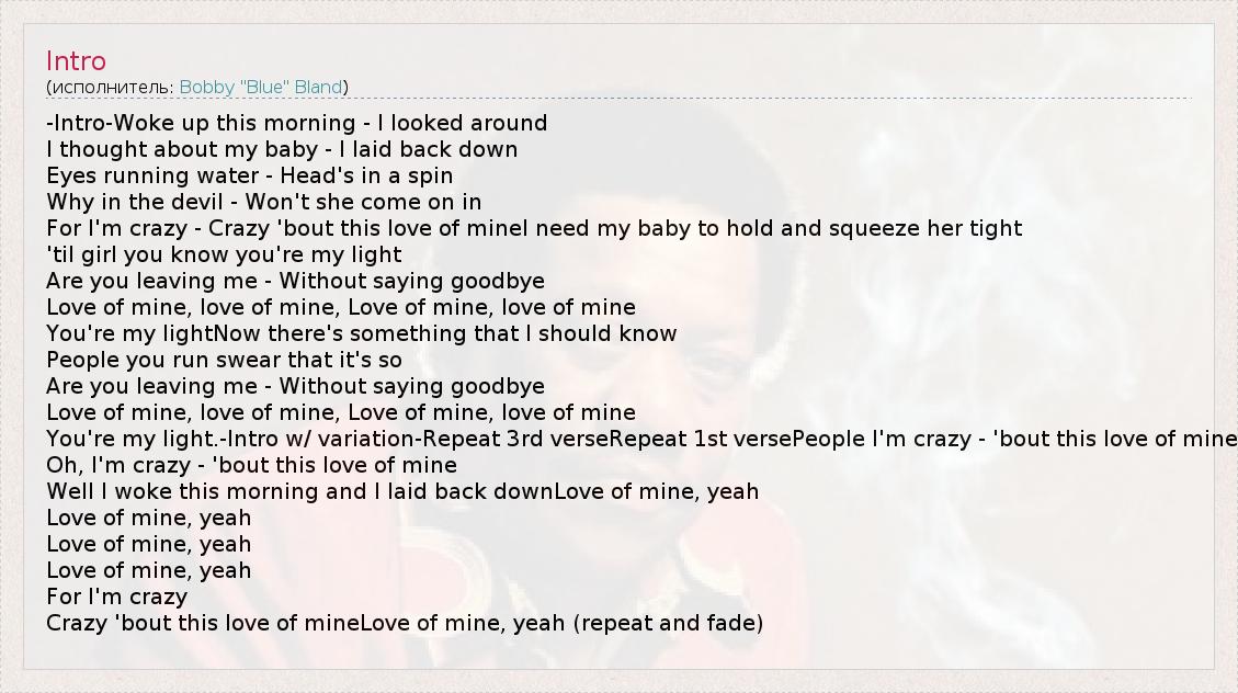 Это интересно:Бобби Блэнд родился в маленьком городе под названием Розмарк, штат Теннесси, США. Позднее вместе с матерью переехал в Мемфис, где впервые стал петь с местными группами, исполняющими госпел. Стремительно расширяя горизонт своих интересов, он начал все чаще появляться на знаменитой улице Мемфиса «Бил Стрит» (Beale Street). Там он знакомится с узким кругом увлеченных музыкантов, оправданно называющих... продолжение