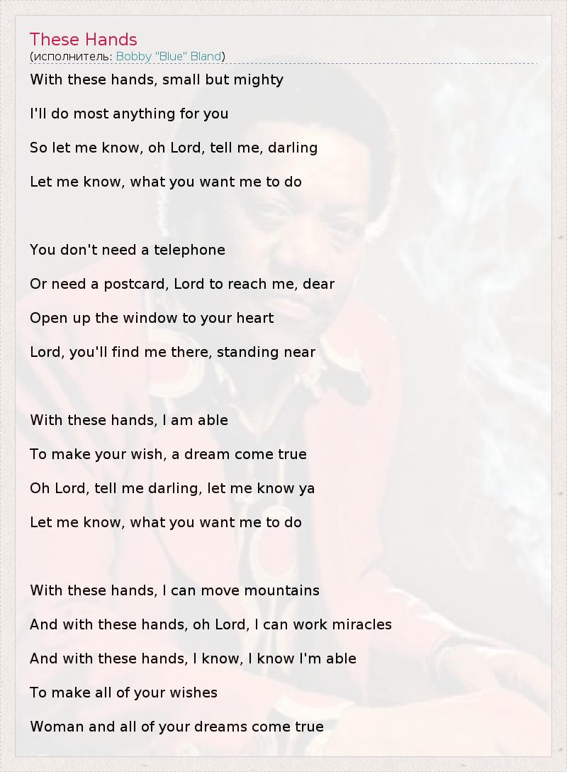 With these hands, small but mighty I'll do most anything for you So let me know, oh Lord, tell me, darling Let me know, what you want me to do You don't need a telephone Or need a postcard, Lord to reach me, dear Open up the window to your heart Lord, you'll find me there, standing near With these hands, I am able To make your wish, a dream come true Oh Lord, tell me darling, let me know ya Let me know, what you want me to do With these hands, I can move mountains And with these hands, oh Lord, I can work miracles And with these hands, I know, I know I'm able To make all of your wishes Woman and all of your dreams come true
