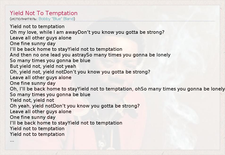 Yield not to temptation Oh my love, while I am awayDon't you know you gotta be strong? Leave all other guys alone One fine sunny day I'll be back home to stayYield not to temptation And then no one lead you astraySo many times you gonna be lonely So many times you gonna be blue But yield not, yield not yeah Oh, yield not, yield notDon't you know you gotta be strong? Leave all other guys alone One fine sunny day Oh, I'll be back home to stayYield not to temptation, ohSo many times you gonna be lonely So many times you gonna be blue Yield not, yield not Oh yeah, yield notDon't you know you gotta be strong? Leave all other guys alone One fine sunny day I'll be back home to stayYield not to temptation Yield not to temptation Yield not to temptation ...
