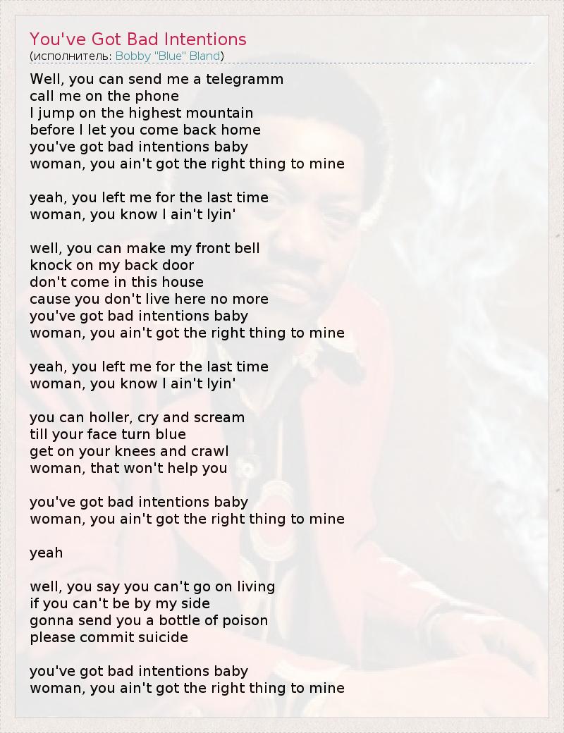 Well, you can send me a telegramm call me on the phone I jump on the highest mountain before I let you come back home you've got bad intentions baby woman, you ain't got the right thing to mine yeah, you left me for the last time woman, you know I ain't lyin' well, you can make my front bell knock on my back door don't come in this house cause you don't live here no more you've got bad intentions baby woman, you ain't got the right thing to mine yeah, you left me for the last time woman, you know I ain't lyin' you can holler, cry and scream till your face turn blue get on your knees and crawl woman, that won't help you you've got bad intentions baby woman, you ain't got the right thing to mine yeah well, you say you can't go on living if you can't be by my side gonna send you a bottle of poison please commit suicide you've got bad intentions baby woman, you ain't got the right thing to mine