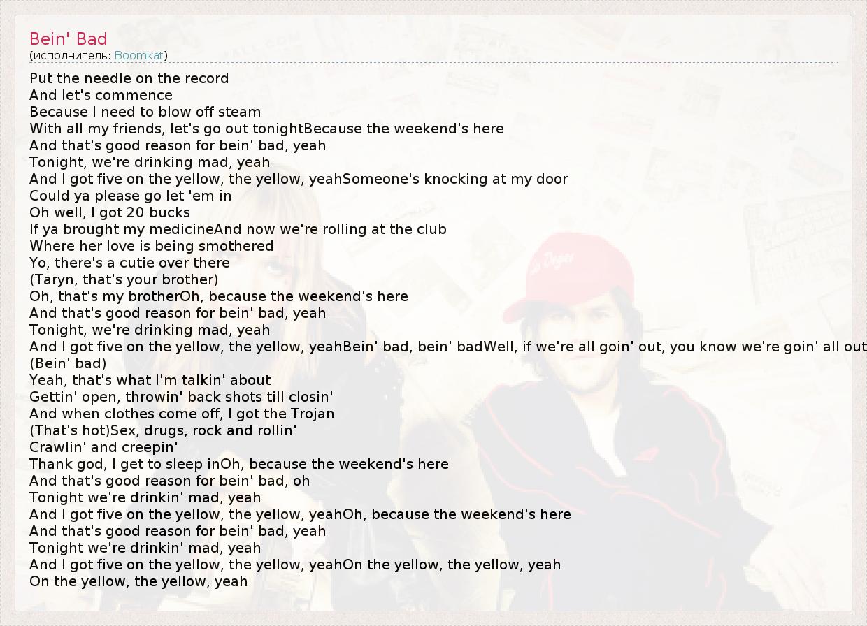 Put the needle on the record And let's commence Because I need to blow off steam With all my friends, let's go out tonightBecause the weekend's here And that's good reason for bein' bad, yeah Tonight, we're drinking mad, yeah And I got five on the yellow, the yellow, yeahSomeone's knocking at my door Could ya please go let 'em in Oh well, I got 20 bucks If ya brought my medicineAnd now we're rolling at the club Where her love is being smothered Yo, there's a cutie over there (Taryn, that's your brother) Oh, that's my brotherOh, because the weekend's here And that's good reason for bein' bad, yeah Tonight, we're drinking mad, yeah And I got five on the yellow, the yellow, yeahBein' bad, bein' badWell, if we're all goin' out, you know we're goin' all out (Bein' bad) Yeah, that's what I'm talkin' about Gettin' open, throwin' back shots till closin' And when clothes come off, I got the Trojan (That's hot)Sex, drugs, rock and rollin' Crawlin' and creepin' Thank god, I get to sleep inOh, because the weekend's here And that's good reason for bein' bad, oh Tonight we're drinkin' mad, yeah And I got five on the yellow, the yellow, yeahOh, because the weekend's here And that's good reason for bein' bad, yeah Tonight we're drinkin' mad, yeah And I got five on the yellow, the yellow, yeahOn the yellow, the yellow, yeah On the yellow, the yellow, yeah