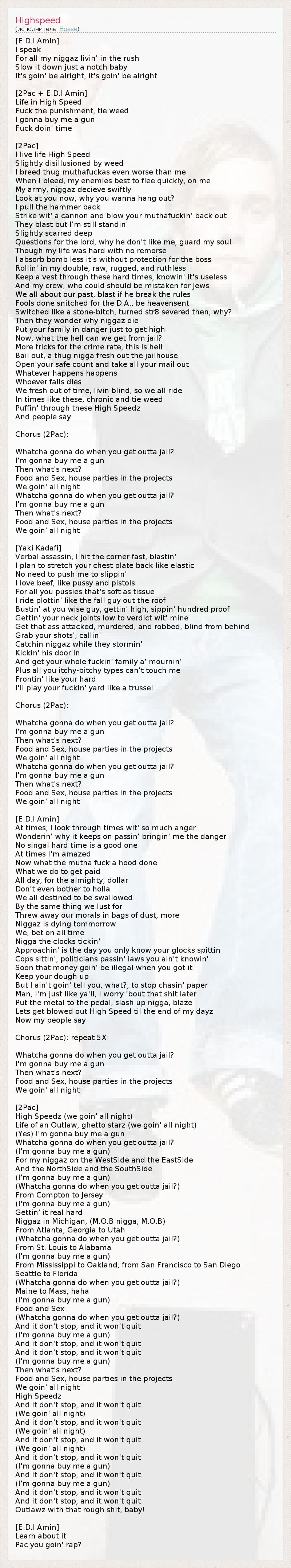 [E.D.I Amin] I speak For all my niggaz livin' in the rush Slow it down just a notch baby It's goin' be alright, it's goin' be alright [2Pac + E.D.I Amin] Life in High Speed Fuck the punishment, tie weed I gonna buy me a gun Fuck doin' time [2Pac] I live life High Speed Slightly disillusioned by weed I breed thug muthafuckas even worse than me When I bleed, my enemies best to flee quickly, on me My army, niggaz decieve swiftly Look at you now, why you wanna hang out? I pull the hammer back Strike wit' a cannon and blow your muthafuckin' back out They blast but I'm still standin' Slightly scarred deep Questions for the lord, why he don't like me, guard my soul Though my life was hard with no remorse I absorb bomb less it's without protection for the boss Rollin' in my double, raw, rugged, and ruthless Keep a vest through these hard times, knowin' it's useless And my crew, who could should be mistaken for Jews We all about our past, blast if he break the rules Fools done snitched for the D.A., be heavensent Switched like a stone-bitch, turned str8 severed then, why? Then they wonder why niggaz die Put your family in danger just to get high Now, what the hell can we get from jail? More tricks for the crime rate, this is hell Bail out, a thug nigga fresh out the jailhouse Open your safe count and take all your mail out Whatever happens happens Whoever falls dies We fresh out of time, livin blind, so we all ride In times like these, chronic and tie weed Puffin' through these High Speedz And people say Chorus (2Pac): Whatcha gonna do when you get outta jail? I'm gonna buy me a gun Then what's next? Food and Sex, house parties in the projects We goin' all night Whatcha gonna do when you get outta jail? I'm gonna buy me a gun Then what's next? Food and Sex, house parties in the projects We goin' all night [Yaki Kadafi] Verbal assassin, I hit the corner fast, blastin' I plan to stretch your chest plate back like elastic No need to push me to slippin' I love beef, like pussy and pistols For all you pussies that's soft as tissue I ride plottin' like the fall guy out the roof Bustin' at you wise guy, gettin' high, sippin' hundred proof Gettin' your neck joints low to verdict wit' mine Get that ass attacked, murdered, and robbed, blind from behind Grab your shots', callin' Catchin niggaz while they stormin' Kickin' his door in And get your whole fuckin' family a' mournin' Plus all you itchy-bitchy types can't touch me Frontin' like your hard I'll play your fuckin' yard like a trussel Chorus (2Pac): Whatcha gonna do when you get outta jail? I'm gonna buy me a gun Then what's next? Food and Sex, house parties in the projects We goin' all night Whatcha gonna do when you get outta jail? I'm gonna buy me a gun Then what's next? Food and Sex, house parties in the projects We goin' all night [E.D.I Amin] At times, I look through times wit' so much anger Wonderin' why it keeps on passin' bringin' me the danger No singal hard time is a good one At times I'm amazed Now what the mutha fuck a hood done What we do to get paid All day, for the almighty, dollar Don't even bother to holla We all destined to be swallowed By the same thing we lust for Threw away our morals in bags of dust, more Niggaz is dying tommorrow We, bet on all time Nigga the clocks tickin' Approachin' is the day you only know your glocks spittin Cops sittin', politicians passin' laws you ain't knowin' Soon that money goin' be illegal when you got it Keep your dough up But I ain't goin' tell you, what?, to stop chasin' paper Man, I'm just like ya'll, I worry 'bout that shit later Put the metal to the pedal, slash up nigga, blaze Lets get blowed out High Speed til the end of my dayz Now my people say Chorus (2Pac): repeat 5X Whatcha gonna do when you get outta jail? I'm gonna buy me a gun Then what's next? Food and Sex, house parties in the projects We goin' all night [2Pac] High Speedz (we goin' all night) Life of an Outlaw, ghetto starz (we goin' all night) (Yes) I'm gonna buy me a gun Whatcha gonna do when you get outta jail? (I'm gonna buy me a gun) For my niggaz on the WestSide and the EastSide And the NorthSide and the SouthSide (I'm gonna buy me a gun) (Whatcha gonna do when you get outta jail?) From Compton to Jersey (I'm gonna buy me a gun) Gettin' it real hard Niggaz in Michigan, (M.O.B nigga, M.O.B) From Atlanta, Georgia to Utah (Whatcha gonna do when you get outta jail?) From St. Louis to Alabama (I'm gonna buy me a gun) From Mississippi to Oakland, from San Francisco to San Diego Seattle to Florida (Whatcha gonna do when you get outta jail?) Maine to Mass, haha (I'm gonna buy me a gun) Food and Sex (Whatcha gonna do when you get outta jail?) And it don't stop, and it won't quit (I'm gonna buy me a gun) And it don't stop, and it won't quit And it don't stop, and it won't quit (I'm gonna buy me a gun) Then what's next? Food and Sex, house parties in the projects We goin' all night High Speedz And it don't stop, and it won't quit (We goin' all night) And it don't stop, and it won't quit (We goin' all night) And it don't stop, and it won't quit (We goin' all night) And it don't stop, and it won't quit (I'm gonna buy me a gun) And it don't stop, and it won't quit (I'm gonna buy me a gun) And it don't stop, and it won't quit And it don't stop, and it won't quit Outlawz with that rough shit, baby! [E.D.I Amin] Learn about it Pac you goin' rap?