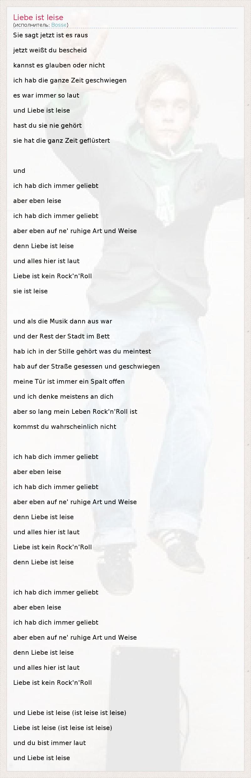 Sie sagt jetzt ist es raus jetzt weißt du bescheid kannst es glauben oder nicht ich hab die ganze Zeit geschwiegen es war immer so laut und Liebe ist leise hast du sie nie gehört sie hat die ganz Zeit geflüstert und ich hab dich immer geliebt aber eben leise ich hab dich immer geliebt aber eben auf ne' ruhige Art und Weise denn Liebe ist leise und alles hier ist laut Liebe ist kein Rock'n'Roll sie ist leise und als die Musik dann aus war und der Rest der Stadt im Bett hab ich in der Stille gehört was du meintest hab auf der Straße gesessen und geschwiegen meine Tür ist immer ein Spalt offen und ich denke meistens an dich aber so lang mein Leben Rock'n'Roll ist kommst du wahrscheinlich nicht ich hab dich immer geliebt aber eben leise ich hab dich immer geliebt aber eben auf ne' ruhige Art und Weise denn Liebe ist leise und alles hier ist laut Liebe ist kein Rock'n'Roll denn Liebe ist leise ich hab dich immer geliebt aber eben leise ich hab dich immer geliebt aber eben auf ne' ruhige Art und Weise denn Liebe ist leise und alles hier ist laut Liebe ist kein Rock'n'Roll und Liebe ist leise (ist leise ist leise) Liebe ist leise (ist leise ist leise) und du bist immer laut und Liebe ist leise