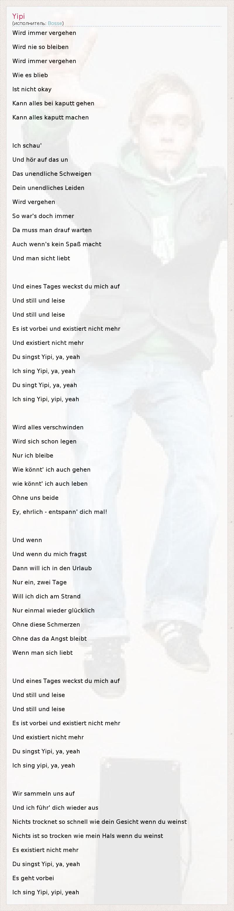 Wird immer vergehen Wird nie so bleiben Wird immer vergehen Wie es blieb Ist nicht okay Kann alles bei kaputt gehen Kann alles kaputt machen Ich schau' Und hör auf das un Das unendliche Schweigen Dein unendliches Leiden Wird vergehen So war's doch immer Da muss man drauf warten Auch wenn's kein Spaß macht Und man sicht liebt Und eines Tages weckst du mich auf Und still und leise Und still und leise Es ist vorbei und existiert nicht mehr Und existiert nicht mehr Du singst Yipi, ya, yeah Ich sing Yipi, ya, yeah Du singt Yipi, ya, yeah Ich sing Yipi, yipi, yeah Wird alles verschwinden Wird sich schon legen Nur ich bleibe Wie könnt' ich auch gehen wie könnt' ich auch leben Ohne uns beide Ey, ehrlich - entspann' dich mal! Und wenn Und wenn du mich fragst Dann will ich in den Urlaub Nur ein, zwei Tage Will ich dich am Strand Nur einmal wieder glücklich Ohne diese Schmerzen Ohne das da Angst bleibt Wenn man sich liebt Und eines Tages weckst du mich auf Und still und leise Und still und leise Es ist vorbei und existiert nicht mehr Und existiert nicht mehr Du singst Yipi, ya, yeah Ich sing yipi, ya, yeah Wir sammeln uns auf Und ich führ' dich wieder aus Nichts trocknet so schnell wie dein Gesicht wenn du weinst Nichts ist so trocken wie mein Hals wenn du weinst Es existiert nicht mehr Du singst Yipi, ya, yeah Es geht vorbei Ich sing Yipi, yipi, yeah