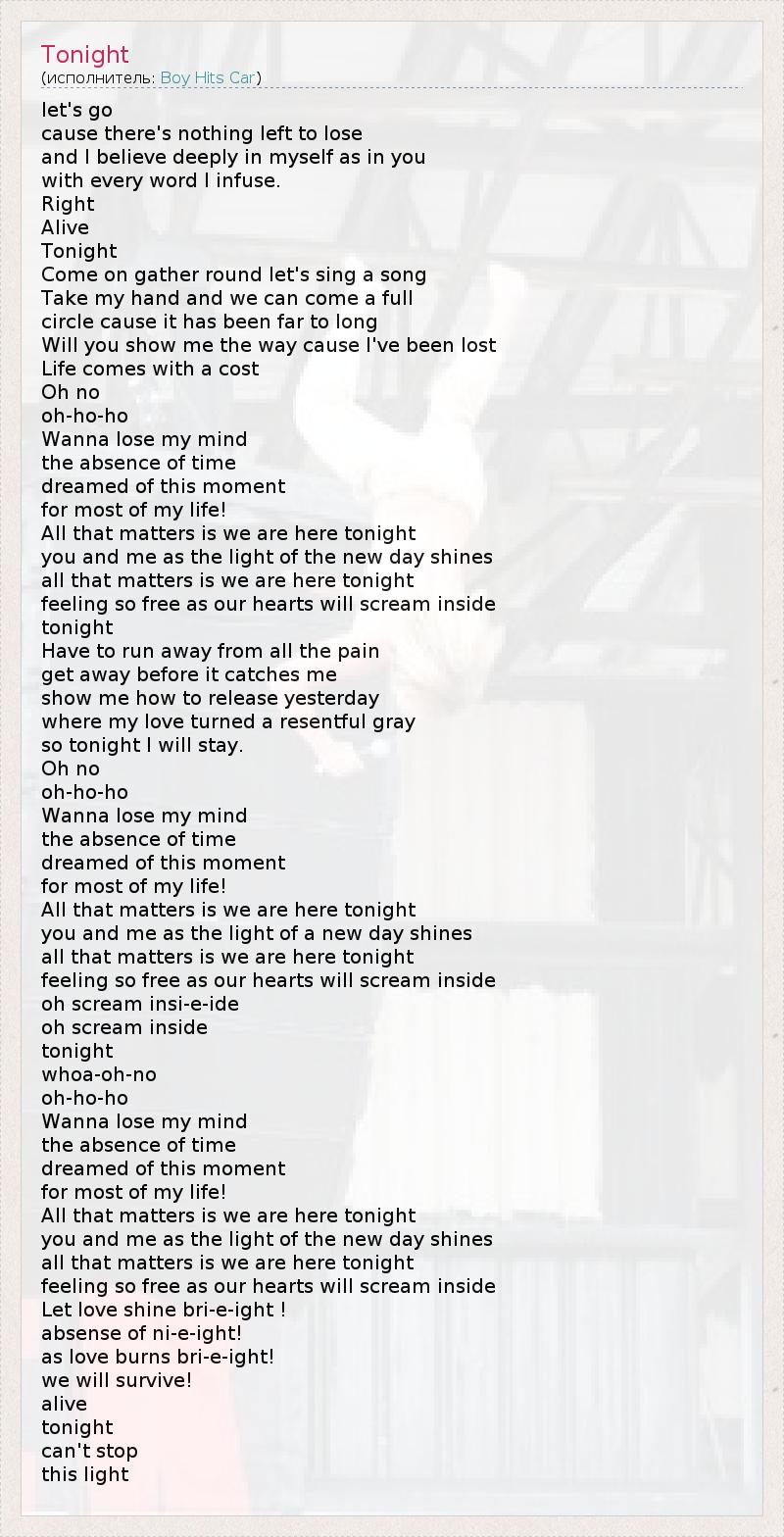 let's go cause there's nothing left to lose and I believe deeply in myself as in you with every word I infuse. Right Alive Tonight Come on gather round let's sing a song Take my hand and we can come a full circle cause it has been far to long Will you show me the way cause I've been lost Life comes with a cost Oh no oh-ho-ho Wanna lose my mind the absence of time dreamed of this moment for most of my life! All that matters is we are here tonight you and me as the light of the new day shines all that matters is we are here tonight feeling so free as our hearts will scream inside tonight Have to run away from all the pain get away before it catches me show me how to release yesterday where my love turned a resentful gray so tonight I will stay. Oh no oh-ho-ho Wanna lose my mind the absence of time dreamed of this moment for most of my life! All that matters is we are here tonight you and me as the light of a new day shines all that matters is we are here tonight feeling so free as our hearts will scream inside oh scream insi-e-ide oh scream inside tonight whoa-oh-no oh-ho-ho Wanna lose my mind the absence of time dreamed of this moment for most of my life! All that matters is we are here tonight you and me as the light of the new day shines all that matters is we are here tonight feeling so free as our hearts will scream inside Let love shine bri-e-ight ! absense of ni-e-ight! as love burns bri-e-ight! we will survive! alive tonight can't stop this light