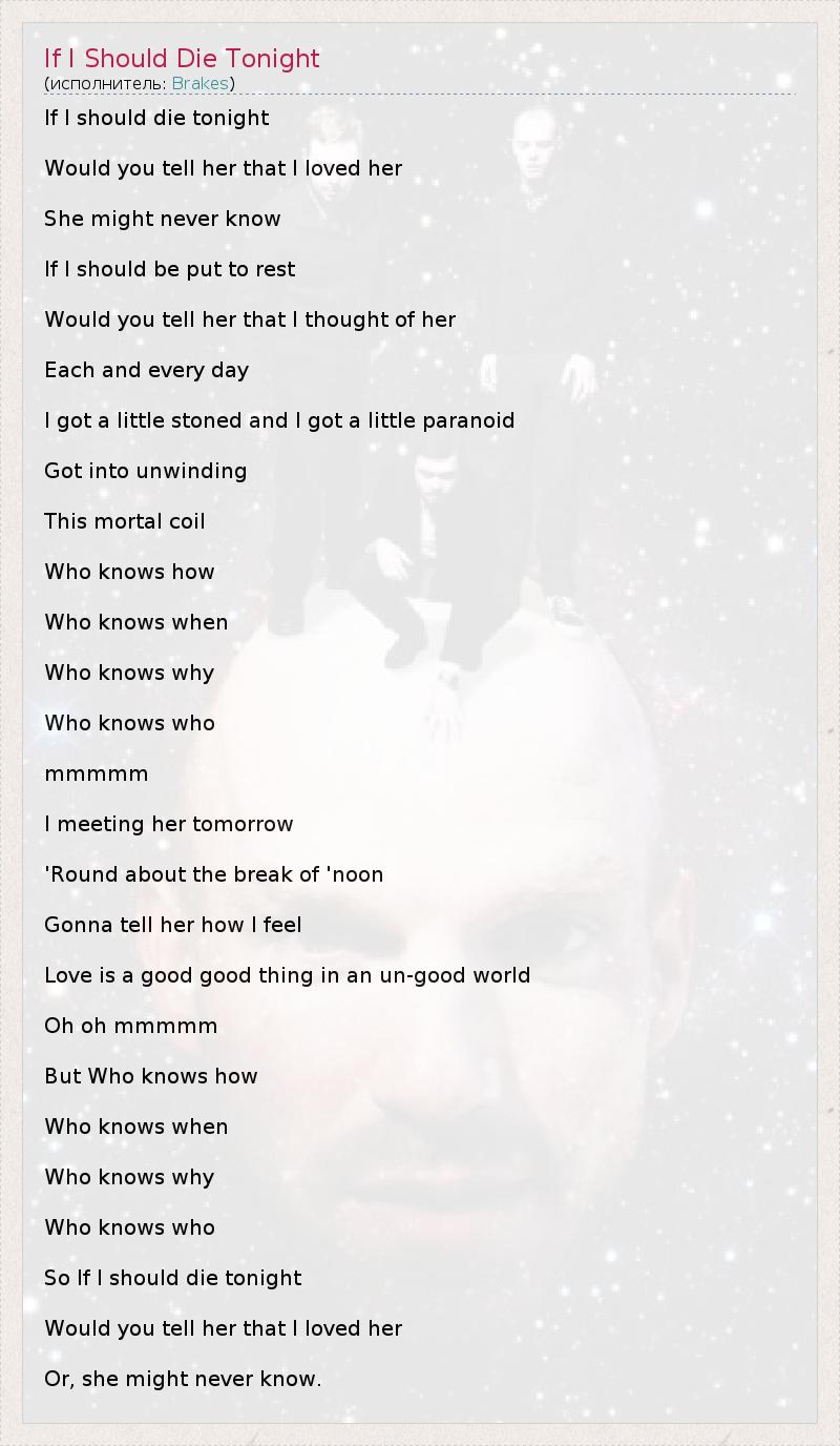 If I should die tonight Would you tell her that I loved her She might never know If I should be put to rest Would you tell her that I thought of her Each and every day I got a little stoned and I got a little paranoid Got into unwinding This mortal coil Who knows how Who knows when Who knows why Who knows who mmmmm I meeting her tomorrow 'Round about the break of 'noon Gonna tell her how I feel Love is a good good thing in an un-good world Oh oh mmmmm But Who knows how Who knows when Who knows why Who knows who So If I should die tonight Would you tell her that I loved her Or, she might never know.