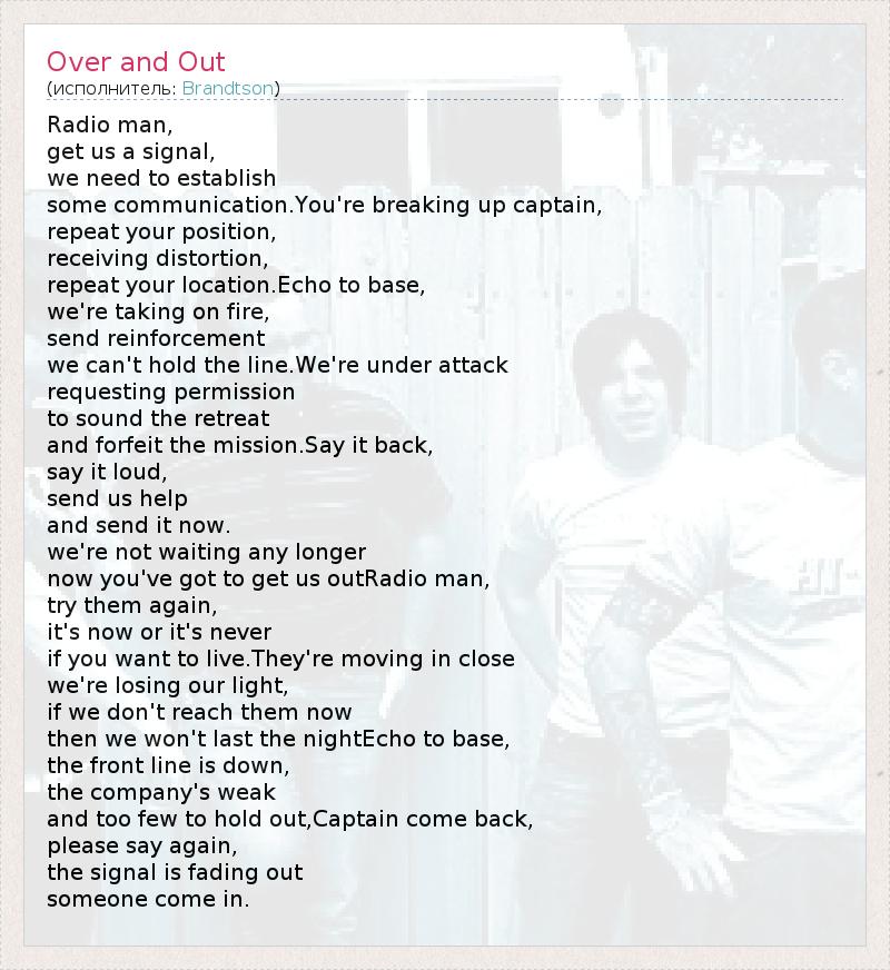 Radio man, get us a signal, we need to establish some communication.You're breaking up captain, repeat your position, receiving distortion, repeat your location.Echo to base, we're taking on fire, send reinforcement we can't hold the line.We're under attack requesting permission to sound the retreat and forfeit the mission.Say it back, say it loud, send us help and send it now. we're not waiting any longer now you've got to get us outRadio man, try them again, it's now or it's never if you want to live.They're moving in close we're losing our light, if we don't reach them now then we won't last the nightEcho to base, the front line is down, the company's weak and too few to hold out,Captain come back, please say again, the signal is fading out someone come in.