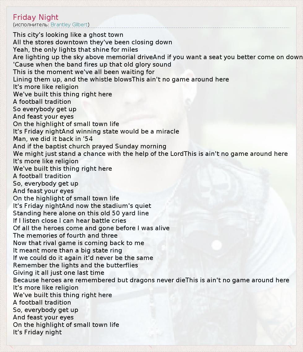 This city's looking like a ghost town All the stores downtown they've been closing down Yeah, the only lights that shine for miles Are lighting up the sky above memorial driveAnd if you want a seat you better come on down 'Cause when the band fires up that old glory sound This is the moment we've all been waiting for Lining them up, and the whistle blowsThis ain't no game around here It's more like religion We've built this thing right here A football tradition So everybody get up And feast your eyes On the highlight of small town life It's Friday nightAnd winning state would be a miracle Man, we did it back in '54 And if the baptist church prayed Sunday morning We might just stand a chance with the help of the LordThis is ain't no game around here It's more like religion We've built this thing right here A football tradition So, everybody get up And feast your eyes On the highlight of small town life It's Friday nightAnd now the stadium's quiet Standing here alone on this old 50 yard line If I listen close I can hear battle cries Of all the heroes come and gone before I was alive The memories of fourth and three Now that rival game is coming back to me It meant more than a big state ring If we could do it again it'd never be the same Remember the lights and the butterflies Giving it all just one last time Because heroes are remembered but dragons never dieThis is ain't no game around here It's more like religion We've built this thing right here A football tradition So, everybody get up And feast your eyes On the highlight of small town life It's Friday night