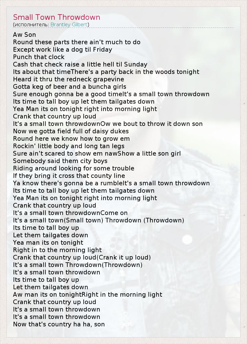 Aw Son Round these parts there ain't much to do Except work like a dog til Friday Punch that clock Cash that check raise a little hell til Sunday Its about that timeThere's a party back in the woods tonight Heard it thru the redneck grapevine Gotta keg of beer and a buncha girls Sure enough gonna be a good timeIt's a small town throwdown Its time to tall boy up let them tailgates down Yea Man its on tonight right into morning light Crank that country up loud It's a small town throwdownOw we bout to throw it down son Now we gotta field full of daisy dukes Round here we know how to grow em Rockin' little body and long tan legs Sure ain't scared to show em nawShow a little son girl Somebody said them city boys Riding around looking for some trouble If they bring it cross that county line Ya know there's gonna be a rumbleIt's a small town throwdown Its time to tall boy up let them tailgates down Yea Man its on tonight right into morning light Crank that country up loud It's a small town throwdownCome on It's a small town(Small town) Throwdown (Throwdown) Its time to tall boy up Let them tailgates down Yea man its on tonight Right in to the morning light Crank that country up loud(Crank it up loud) It's a small town Throwdown(Throwdown) It's a small town throwdown Its time to tall boy up Let them tailgates down Aw man its on tonightRight in the morning light Crank that country up loud It's a small town throwdown It's a small town throwdown Now that's country ha ha, son
