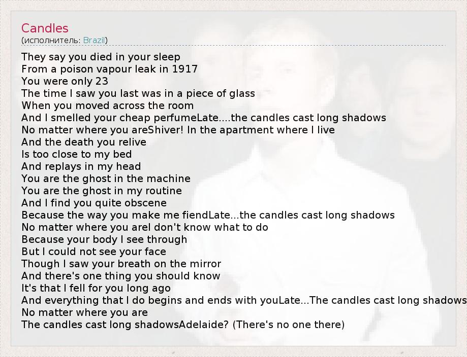 They say you died in your sleep From a poison vapour leak in 1917 You were only 23 The time I saw you last was in a piece of glass When you moved across the room And I smelled your cheap perfumeLate....the candles cast long shadows No matter where you areShiver! In the apartment where I live And the death you relive Is too close to my bed And replays in my head You are the ghost in the machine You are the ghost in my routine And I find you quite obscene Because the way you make me fiendLate...the candles cast long shadows No matter where you areI don't know what to do Because your body I see through But I could not see your face Though I saw your breath on the mirror And there's one thing you should know It's that I fell for you long ago And everything that I do begins and ends with youLate...The candles cast long shadows No matter where you are The candles cast long shadowsAdelaide? (There's no one there)