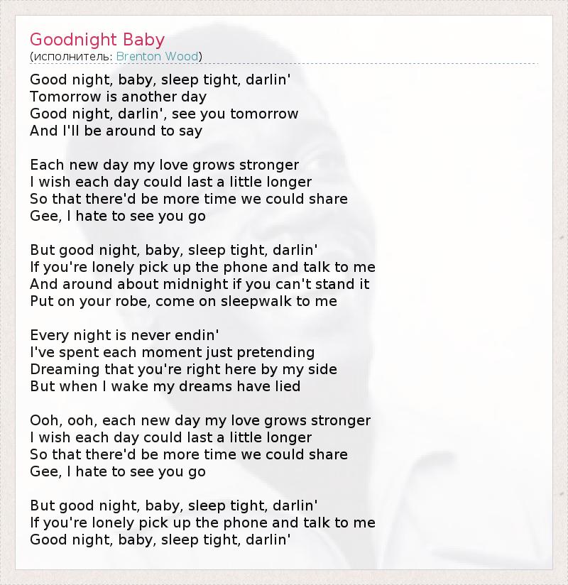 Good night, baby, sleep tight, darlin' Tomorrow is another day Good night, darlin', see you tomorrow And I'll be around to say Each new day my love grows stronger I wish each day could last a little longer So that there'd be more time we could share Gee, I hate to see you go But good night, baby, sleep tight, darlin' If you're lonely pick up the phone and talk to me And around about midnight if you can't stand it Put on your robe, come on sleepwalk to me Every night is never endin' I've spent each moment just pretending Dreaming that you're right here by my side But when I wake my dreams have lied Ooh, ooh, each new day my love grows stronger I wish each day could last a little longer So that there'd be more time we could share Gee, I hate to see you go But good night, baby, sleep tight, darlin' If you're lonely pick up the phone and talk to me Good night, baby, sleep tight, darlin'