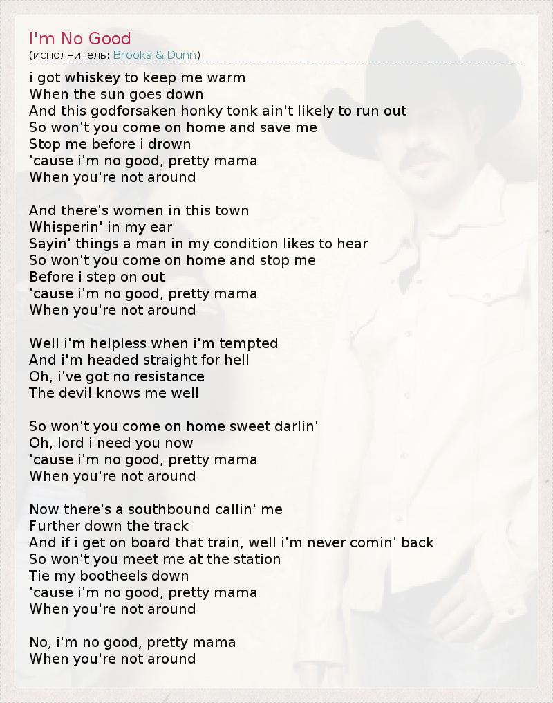 i got whiskey to keep me warm When the sun goes down And this godforsaken honky tonk ain't likely to run out So won't you come on home and save me Stop me before i drown 'cause i'm no good, pretty mama When you're not around And there's women in this town Whisperin' in my ear Sayin' things a man in my condition likes to hear So won't you come on home and stop me Before i step on out 'cause i'm no good, pretty mama When you're not around Well i'm helpless when i'm tempted And i'm headed straight for hell Oh, i've got no resistance The devil knows me well So won't you come on home sweet darlin' Oh, lord i need you now 'cause i'm no good, pretty mama When you're not around Now there's a southbound callin' me Further down the track And if i get on board that train, well i'm never comin' back So won't you meet me at the station Tie my bootheels down 'cause i'm no good, pretty mama When you're not around No, i'm no good, pretty mama When you're not around
