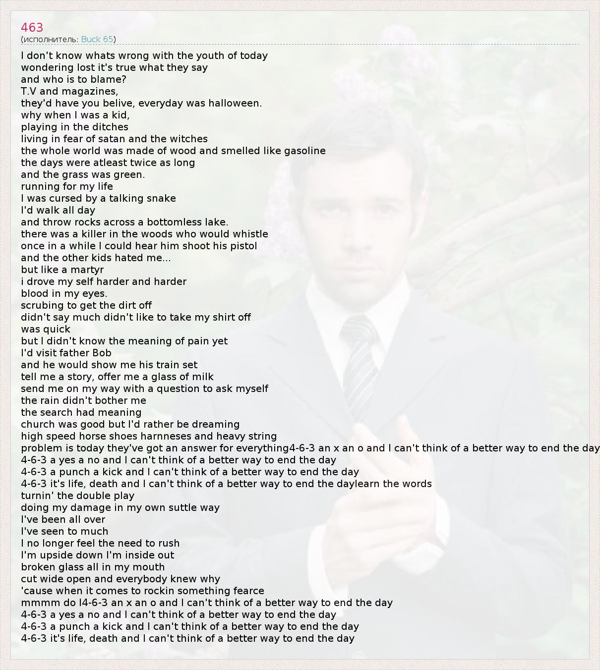 Это интересно:Richard Terfry (родился 4 марта 1972-го года), более известный под именем Buck 65 - легенда канадского хип-хопа. Его роль в развитии современной хип-хоп музыки сложно переоценить. Он стал одним из создетелей современного альтернативного и экспериментального хип-хопа. К тому же его эксперименты уходят далеко за пределы хип-хопа. Он экспериментирует с блюзом, кантри, роком, фолком и авангардом.Детство... продолжение