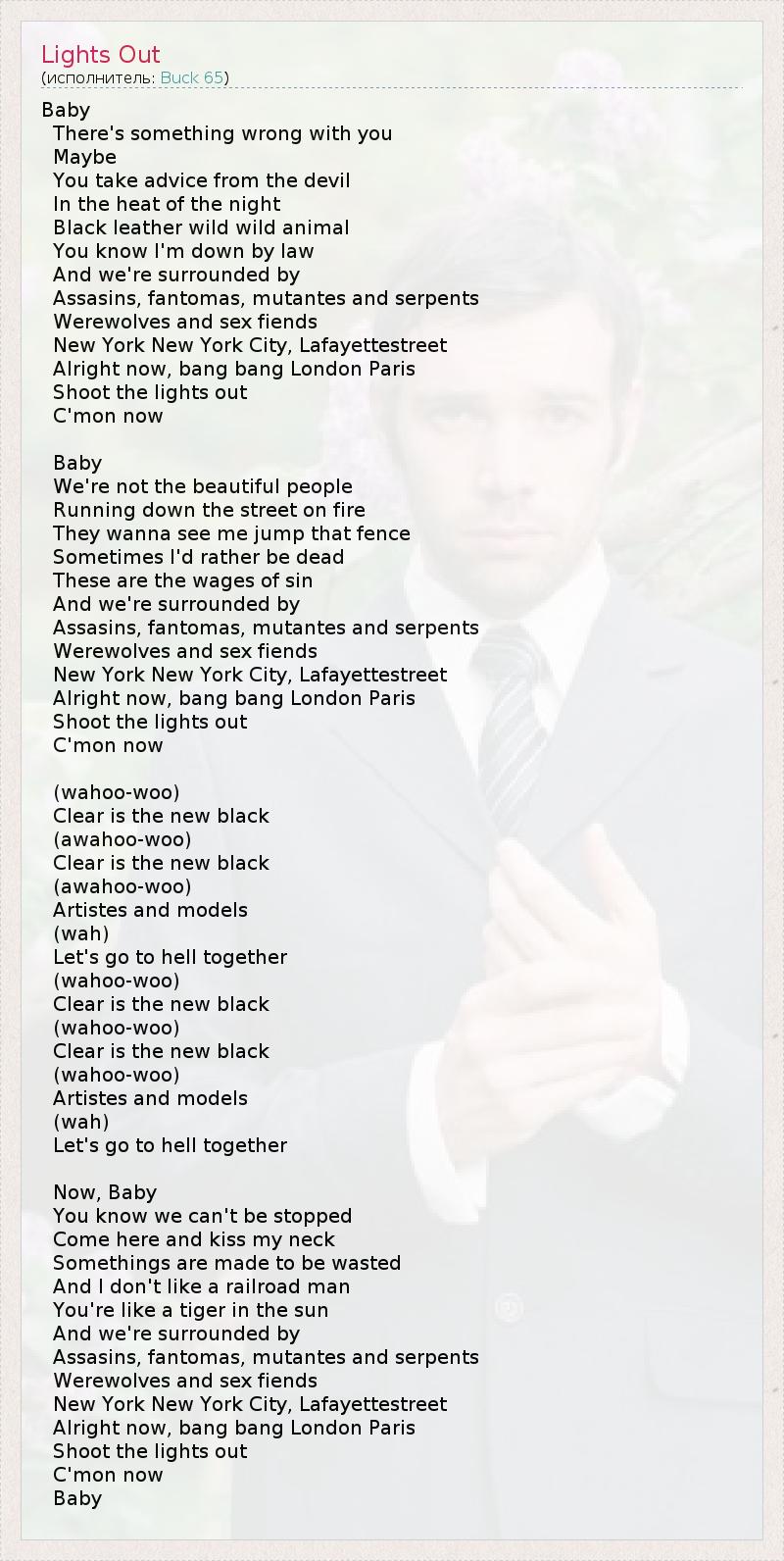 Baby There's something wrong with you Maybe You take advice from the devil In the heat of the night Black leather wild wild animal You know I'm down by law And we're surrounded by Assasins, fantomas, mutantes and serpents Werewolves and sex fiends New York New York City, Lafayettestreet Alright now, bang bang London Paris Shoot the lights out C'mon now Baby We're not the beautiful people Running down the street on fire They wanna see me jump that fence Sometimes I'd rather be dead These are the wages of sin And we're surrounded by Assasins, fantomas, mutantes and serpents Werewolves and sex fiends New York New York City, Lafayettestreet Alright now, bang bang London Paris Shoot the lights out C'mon now (wahoo-woo) Clear is the new black (awahoo-woo) Clear is the new black (awahoo-woo) Artistes and models (wah) Let's go to hell together (wahoo-woo) Clear is the new black (wahoo-woo) Clear is the new black (wahoo-woo) Artistes and models (wah) Let's go to hell together Now, Baby You know we can't be stopped Come here and kiss my neck Somethings are made to be wasted And I don't like a railroad man You're like a tiger in the sun And we're surrounded by Assasins, fantomas, mutantes and serpents Werewolves and sex fiends New York New York City, Lafayettestreet Alright now, bang bang London Paris Shoot the lights out C'mon now Baby