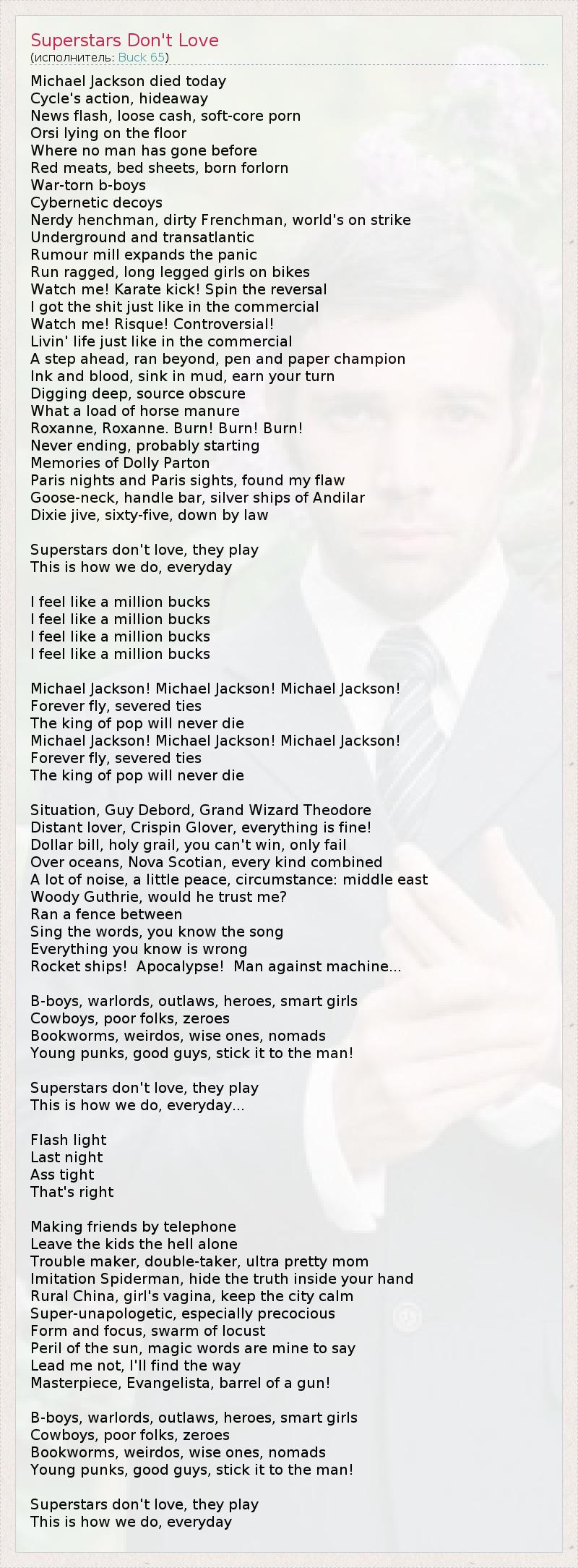 Michael Jackson died today Cycle's action, hideaway News flash, loose cash, soft-core porn Orsi lying on the floor Where no man has gone before Red meats, bed sheets, born forlorn War-torn b-boys Cybernetic decoys Nerdy henchman, dirty Frenchman, world's on strike Underground and transatlantic Rumour mill expands the panic Run ragged, long legged girls on bikes Watch me! Karate kick! Spin the reversal I got the shit just like in the commercial Watch me! Risque! Controversial! Livin' life just like in the commercial A step ahead, ran beyond, pen and paper champion Ink and blood, sink in mud, earn your turn Digging deep, source obscure What a load of horse manure Roxanne, Roxanne. Burn! Burn! Burn! Never ending, probably starting Memories of Dolly Parton Paris nights and Paris sights, found my flaw Goose-neck, handle bar, silver ships of Andilar Dixie jive, sixty-five, down by law Superstars don't love, they play This is how we do, everyday I feel like a million bucks I feel like a million bucks I feel like a million bucks I feel like a million bucks Michael Jackson! Michael Jackson! Michael Jackson! Forever fly, severed ties The king of pop will never die Michael Jackson! Michael Jackson! Michael Jackson! Forever fly, severed ties The king of pop will never die Situation, Guy Debord, Grand Wizard Theodore Distant lover, Crispin Glover, everything is fine! Dollar bill, holy grail, you can't win, only fail Over oceans, Nova Scotian, every kind combined A lot of noise, a little peace, circumstance: middle east Woody Guthrie, would he trust me? Ran a fence between Sing the words, you know the song Everything you know is wrong Rocket ships! Apocalypse! Man against machine... B-boys, warlords, outlaws, heroes, smart girls Cowboys, poor folks, zeroes Bookworms, weirdos, wise ones, nomads Young punks, good guys, stick it to the man! Superstars don't love, they play This is how we do, everyday... Flash light Last night Ass tight That's right Making friends by telephone Leave the kids the hell alone Trouble maker, double-taker, ultra pretty mom Imitation Spiderman, hide the truth inside your hand Rural China, girl's vagina, keep the city calm Super-unapologetic, especially precocious Form and focus, swarm of locust Peril of the sun, magic words are mine to say Lead me not, I'll find the way Masterpiece, Evangelista, barrel of a gun! B-boys, warlords, outlaws, heroes, smart girls Cowboys, poor folks, zeroes Bookworms, weirdos, wise ones, nomads Young punks, good guys, stick it to the man! Superstars don't love, they play This is how we do, everyday