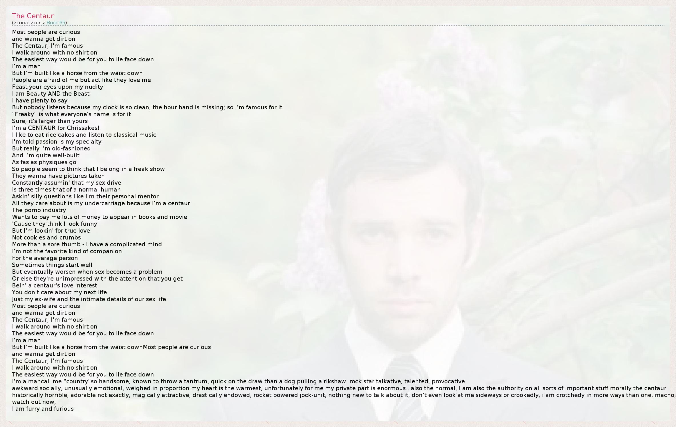 Most people are curious and wanna get dirt on The Centaur; I'm famous I walk around with no shirt on The easiest way would be for you to lie face down I'm a man But I'm built like a horse from the waist down People are afraid of me but act like they love me Feast your eyes upon my nudity I am Beauty AND the Beast I have plenty to say But nobody listens because my clock is so clean, the hour hand is missing; so I'm famous for it "Freaky" is what everyone's name is for it Sure, it's larger than yours I'm a CENTAUR for Chrissakes! I like to eat rice cakes and listen to classical music I'm told passion is my specialty But really I'm old-fashioned And I'm quite well-built As fas as physiques go So people seem to think that I belong in a freak show They wanna have pictures taken Constantly assumin' that my sex drive is three times that of a normal human Askin' silly questions like I'm their personal mentor All they care about is my undercarriage because I'm a centaur The porno industry Wants to pay me lots of money to appear in books and movie 'Cause they think I look funny But I'm lookin' for true love Not cookies and crumbs More than a sore thumb - I have a complicated mind I'm not the favorite kind of companion For the average person Sometimes things start well But eventually worsen when sex becomes a problem Or else they're unimpressed with the attention that you get Bein' a centaur's love interest You don't care about my next life Just my ex-wife and the intimate details of our sex life Most people are curious and wanna get dirt on The Centaur; I'm famous I walk around with no shirt on The easiest way would be for you to lie face down I'm a man But I'm built like a horse from the waist downMost people are curious and wanna get dirt on The Centaur; I'm famous I walk around with no shirt on The easiest way would be for you to lie face down I'm a mancall me "country"so handsome, known to throw a tantrum, quick on the draw than a dog pulling a rikshaw. rock star talkative, talented, provocative awkward socially, unusually emotional, weighed in proportion my heart is the warmest, unfortunately for me my private part is enormous.. also the normal, I am also the authority on all sorts of important stuff morally the centaur historically horrible, adorable not exactly, magically attractive, drastically endowed, rocket powered jock-unit, nothing new to talk about it, don't even look at me sideways or crookedly, i am crotchedy in more ways than one, macho, watch out now, I am furry and furious