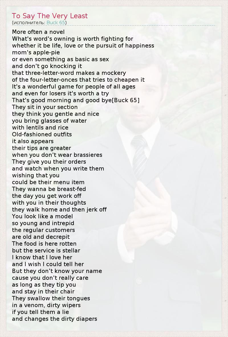 More often a novel What's word's owning is worth fighting for whether it be life, love or the pursuit of happiness mom's apple-pie or even something as basic as sex and don't go knocking it that three-letter-word makes a mockery of the four-letter-onces that tries to cheapen it It's a wonderful game for people of all ages and even for losers it's worth a try That's good morning and good bye[Buck 65] They sit in your section they think you gentle and nice you bring glasses of water with lentils and rice Old-fashioned outfits it also appears their tips are greater when you don't wear brassieres They give you their orders and watch when you write them wishing that you could be their menu item They wanna be breast-fed the day you get work off with you in their thoughts they walk home and then jerk off You look like a model so young and intrepid the regular customers are old and decrepit The food is here rotten but the service is stellar I know that I love her and I wish I could tell her But they don't know your name cause you don't really care as long as they tip you and stay in their chair They swallow their tongues in a venom, dirty wipers if you tell them a lie and changes the dirty diapers