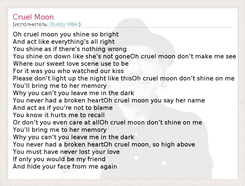 Oh cruel moon you shine so bright And act like everything's all right You shine as if there's nothing wrong You shine on down like she's not goneOh cruel moon don't make me see Where our sweet love scene use to be For it was you who watched our kiss Please don't light up the night like thisOh cruel moon don't shine on me You'll bring me to her memory Why you can't you leave me in the dark You never had a broken heartOh cruel moon you say her name And act as if you're not to blame You know it hurts me to recall Or don't you even care at allOh cruel moon don't shine on me You'll bring me to her memory Why you can't you leave me in the dark You never had a broken heartOh cruel moon, so high above You must have never lost your love If only you would be my friend And hide your face from me again